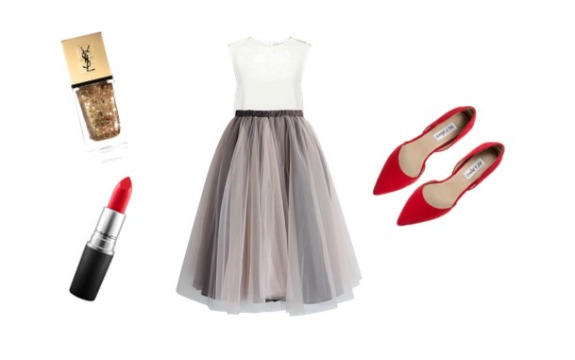 Como ves es muy sencillo pero con toques festivos, la falda ya es súper llamativa así que no quería añadirle ni collares, pulseras ni nada de nada. Un poco de color en las uñas y los zapatos que tenemos que llevar siempre y asi no me como la cabeza luego a la hora de llegar las uvas buscando algo rojo o metiendo un anillo en la copa de champan jejejejejeje