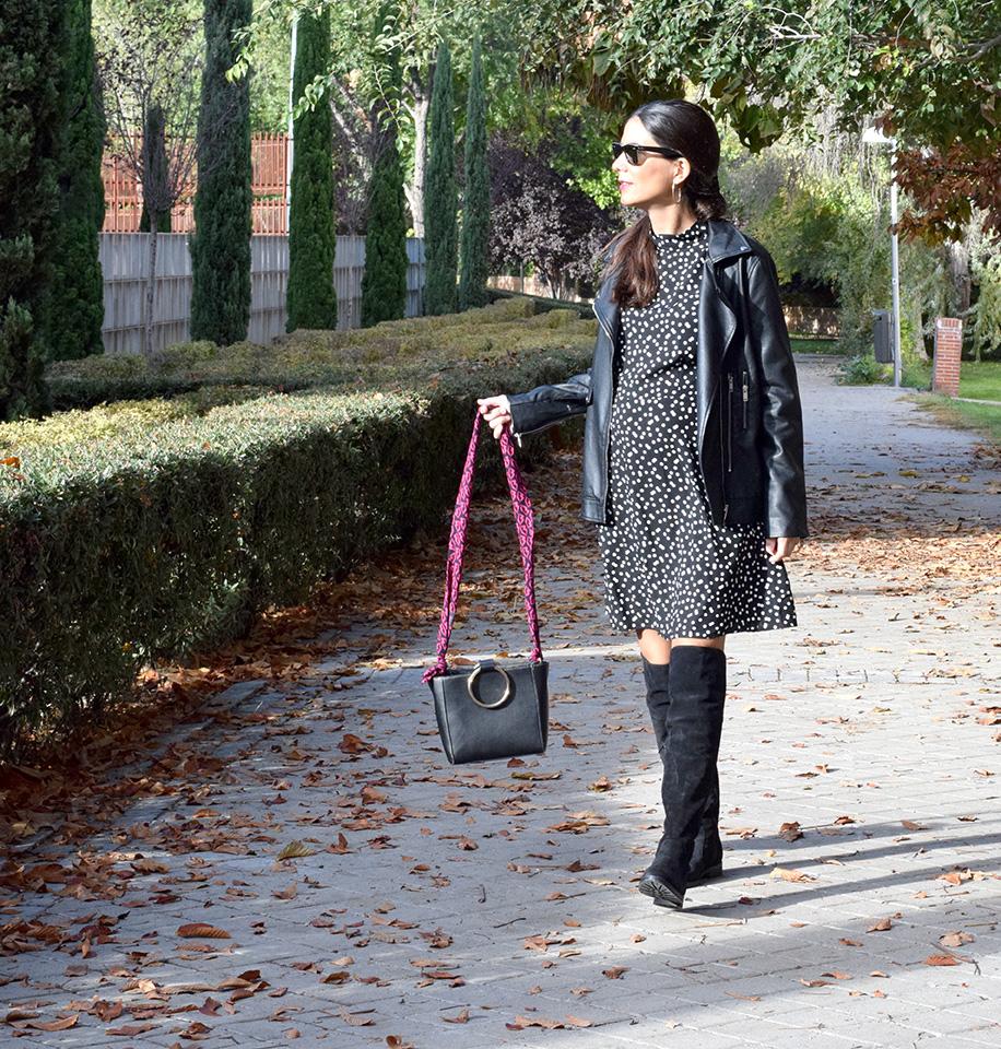 Otra de las tendencias de la temporada son los lunares. Aunque debo confesar que para mi siempre han estado de moda porque tengo mil prendas y las uso mucho. Me encantan. Pero cierto es que este otoño vamos a ver muchos topos por las tiendas y por las calles. Este vestido concretamente es de Zara, no es especial de premamá pero al tener el corte debajo del pecho se adapta muy bien a mi nueva figura.