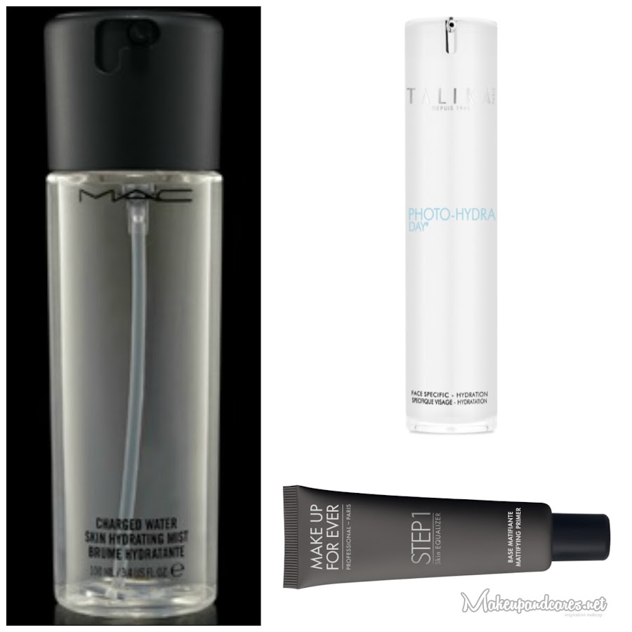 La crema de Talika aunque es la versión de dia me gusta mucho como queda en la piel y mezclada con la bruma hidratante de Mac equilibra muy bien la piel . En la zona de los granitos que era principalmente en la barbilla, utilicé la base matificante Step 1 de Make Up For Ever en el tono verde, de esa manera neutralizaba las rojeces y matificaba la zona .