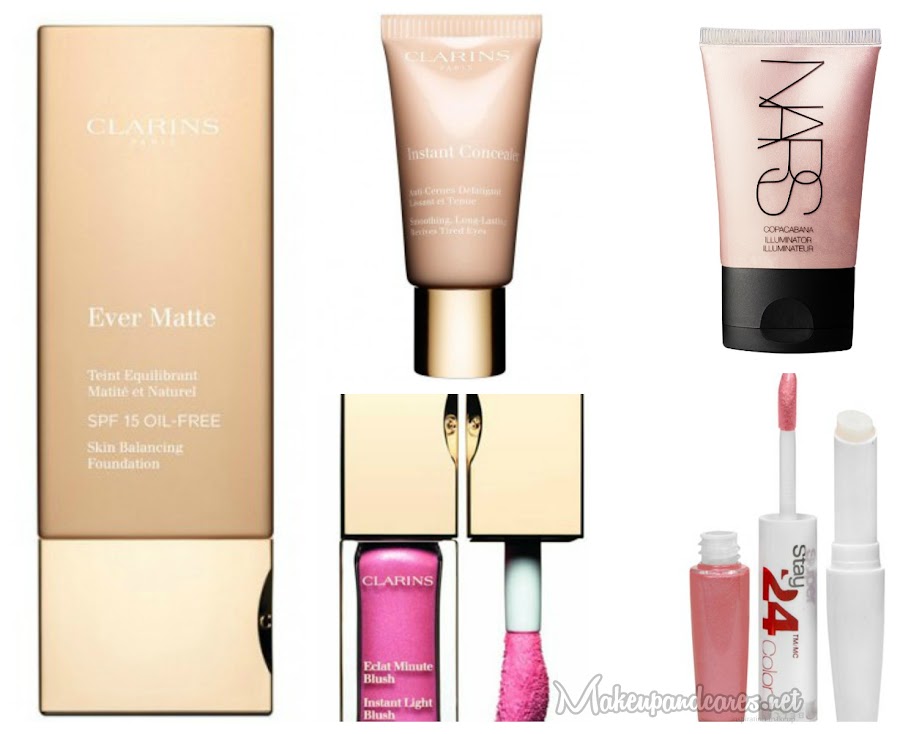 En los labios apliqué un labial rosa palo de larga duración de Maybelline , y finalmente el toque de luz lo dio el iluminador Copacabana de Nars .