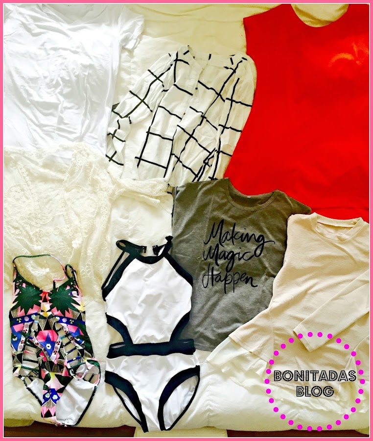 Después, hice mi recopilación. Como tenía el 40% de descuento por ser la primera compra, me dejé llevar. Un vestido, tres camisetas, una chaqueta de encaje, dos bañadores y una camisa.