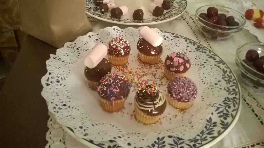 Cupcakes con cobertura de chocolate y espolvoreado de diferentes toppings (corazones, virutas de chocolate y nubes). Un kit muy usado de estos productos es el de Dr.Oetker que tiene un gran surtido de productos para la tan de moda "pastelería creativa" que lleva tanto tiempo causando adeptos con el uso del fondant, las cremas, los toppings de la mano de chicas como Alma Obregón.