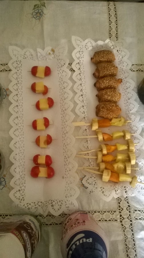 Nos obsequió con una brocheta dulce de gominolas además de varias bandejas de picoteos dulces y salados: banderillas de tomate cherry y dados de queso, brochetas de plátano, piña y melocotón y miniempanadillas de verdura. Además de dos boles con cerezas.