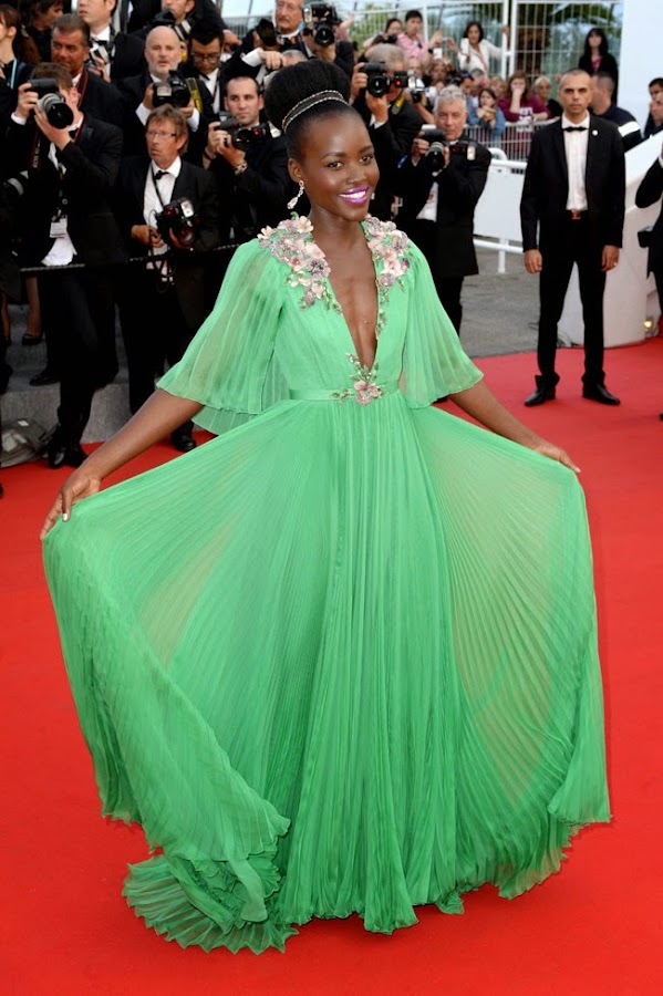 Lupita Nyong"o: Gucci. Otro vestido más que pone de manifiesto el rumbo hacia lo romántico de la firma. Este vestido llamó mi atención por varias cosas buenas: las flores románticas, las mangas caídas, el cinturón de cinta y lo vaporoso. Si fuera por esas cosas le pondría un 10, PERO. Llamó mi atención para fatal ese color verde de rotulador de colegio. Lupita es negra, y la combinación con su tono de piel es horrible. Suspenso.