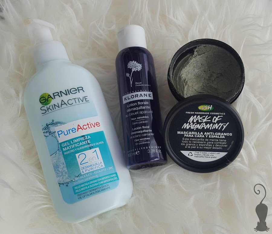 Para la limpieza facial, utilizo el desmaquillante de ojos de Klorane, y para el rostro el gel de limpieza Pure Active de Garnier, ambos me están funcionando muy bien. El desmaquillante de ojos me gusta porque no me escuece nada al desmaquillarlos y elimina genial todo tipo de máscaras de pestañas y eyeliners, sean o no resistentes al agua. El gel de limpieza también genial, no me irrita nada la piel, tengo la piel mixta y no me la deja tirante, ni me aporta grasa ni nada, perfecto. Una vez a la semana me gusta aplicarme la mascarilla Mask of magnaminty de Lush, es una mascarilla anti granos para cara y espalda. A mi me deja la piel increíble de limpia, huele mucho a menta y escuece un poco al aplicarla pero nada que no se aguante, se va secando y después de 10-15 minutos yo la retiro con agua tibia y me deja la piel genial, poros cerrados y aspecto de buena cara.