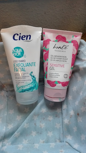 Mi piel está mucho más sensible de lo normal, así que por las mañanas me elimino la suciedad de la noche con el gel limpiador para pieles sensibles de Bonté. Limpia bastante bien y me gusta porque deja la piel fresquita y tirante. Por la noche uso el limpiador exfoliante de uso diario de Cien, la marca de Lidl. Es un exfoliante suave que deja la piel suave y limpia, así que me gusta mucho para antes de dormir. Cada uno cuesta unos 3 euros.