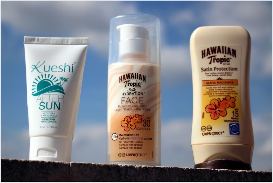 Como veis en la foto, hoy os hablaré de dos productos de Hawaiian Tropic (la crema solar Ultra Radiance y la facial Silk Hydration) y uno de Kueshi, el after sun hidratante antioxidante. Los tres productos los he probado estas vacaciones; como veis, son minitallas de 100 ml para poder meterlas en la maleta de mano, pero también os puede servir para probar el producto antes de comprar su talla original (o si vais poco a la playa, así no se os caduca la crema de un año para otro).