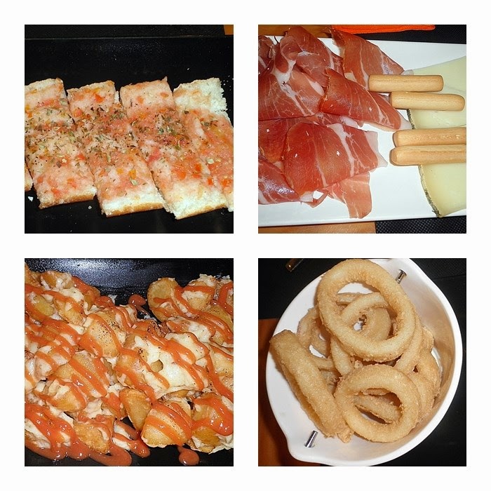 Pan con tomate, Jamón de Teruel y queso, Patas bravas, Calamares a la romana