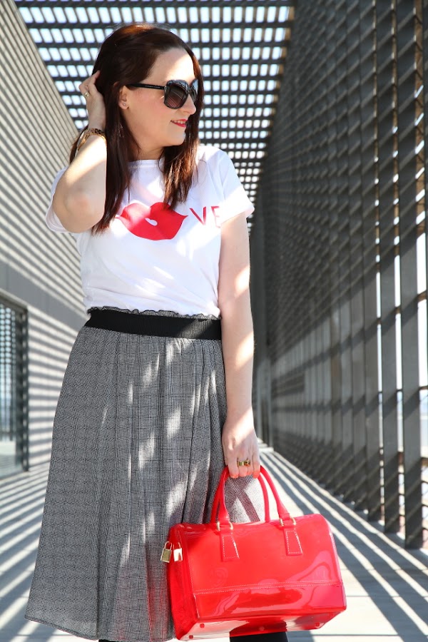 Para San Valentín me llegó esta preciosa camiseta de Mi Vida en Rojo y aunque tenía muchas ganas de estrenarla esperé a que hiciera mejor tiempo para poder llevarla sin nada encima. Durante mis pasadas vacaciones los días fueron tan buenos que enseguida pensé en ella y este fue el look que elegí para estrenarla. En un principio pensé en combinarla con unos jeans, pero finalmente opté por un look más lady con una falda midi que llevaba en el armario desde el invierno esperando a ser estrenada. En los pies unos stilettos rojos que acompañé con mi bolso rojo preferido.