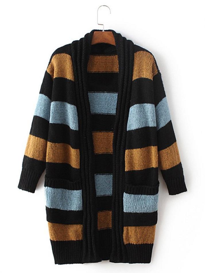El Cardigan con rayas en tres colores, me parece muy moderno y también tiene bolsillos, me lo imagino con jeans y quizá con un LBD (Little Black Dress).