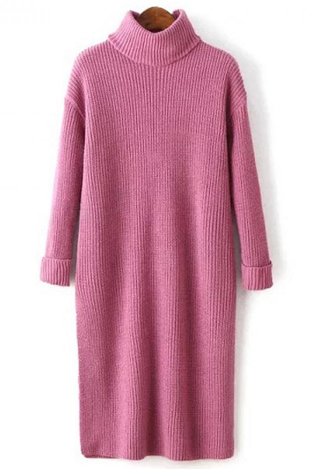 Fashionable Turtle Neck Long Sleeve Solid Color Side Slit Women’s Sweater Dress