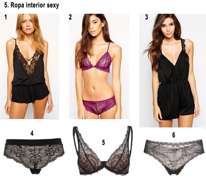 1. Mono con encaje / 2. Conjunto lencería / 3. Mono con ribete de encaje / 4. Tanga Lascana / 5. Sujetador Calvin Klein / 6. Tanga Cosabella