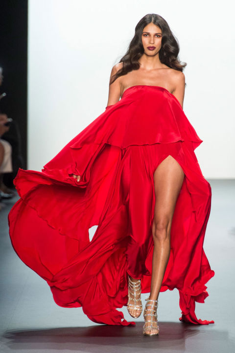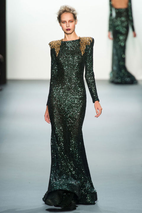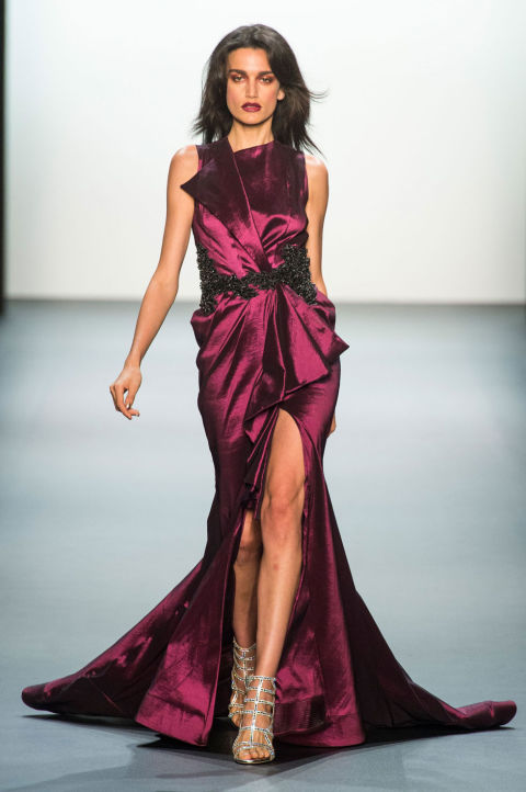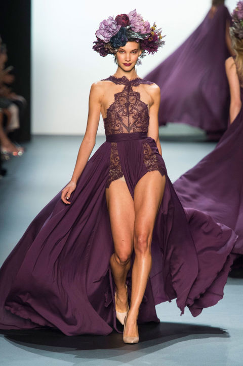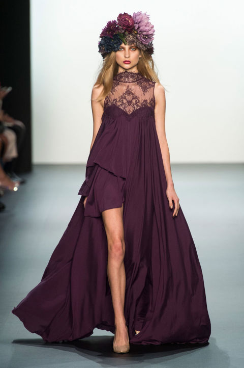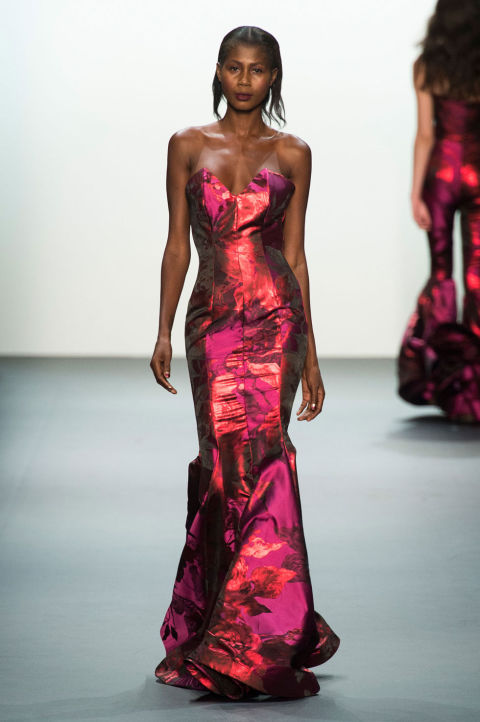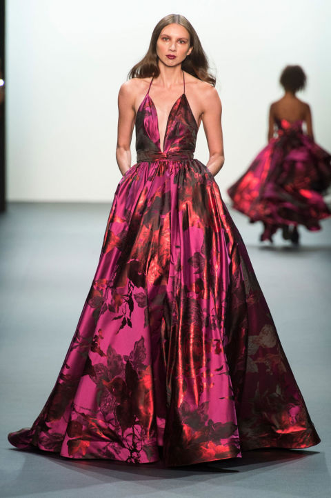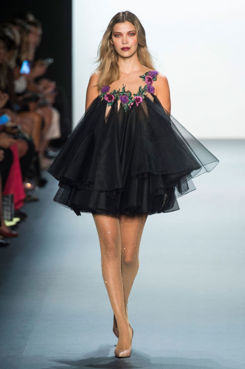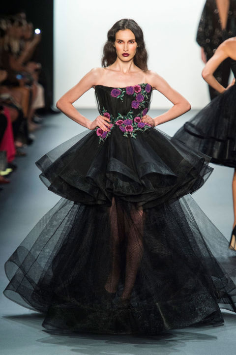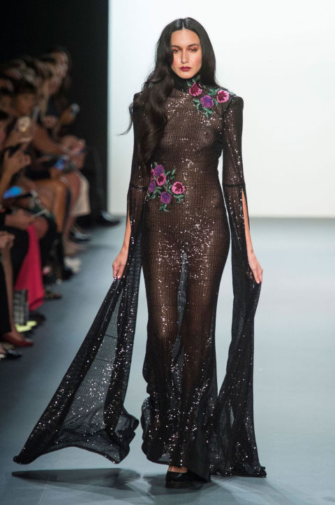 Un espectacular diseño que pertenece a la colección primavera/verano 2017 presentada el pasado día 8 de este mes durante una nueva edición de NYFW. Para esta colección, donde los colores predominantes son el violeta, el verde, el rojo y por supuesto el negro, Michael Costello se inspiró en un jardín botánico en la medianoche, de ahí que una de las características a destacar sean los bordados florales y las coronas de flores que lucen las modelos.