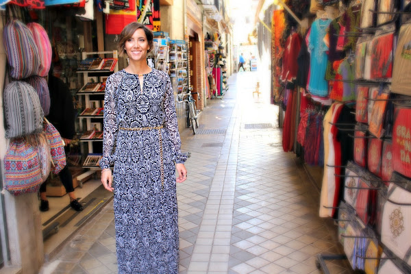 Un vestido largo, ligero, con manga larga y un estampado precioso. ¿Sabéis la de piropos que recibió mientras me hacía estas fotos? Me parece perfecto para el día a día e incluso para un evento tipo comunión o bautizo, de esos que abundan en estas fechas. Además, el estampado me recordó tanto a la artesanía típica granadina que en cuanto vi una de las muchas tiendas que tenemos en la ciudad no dudé en pedir permiso para hacer unas fotos en ella. Si casi me camuflo con los platos y demás loza!!