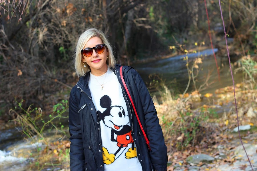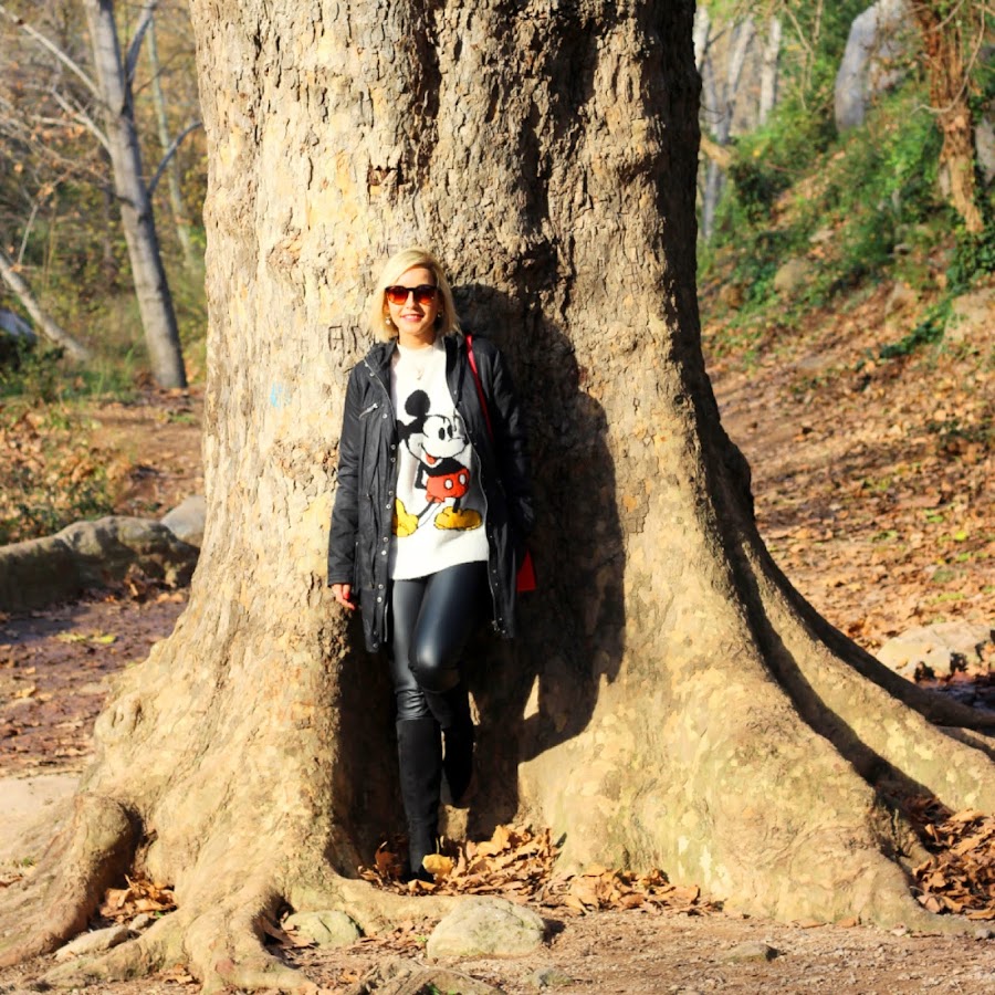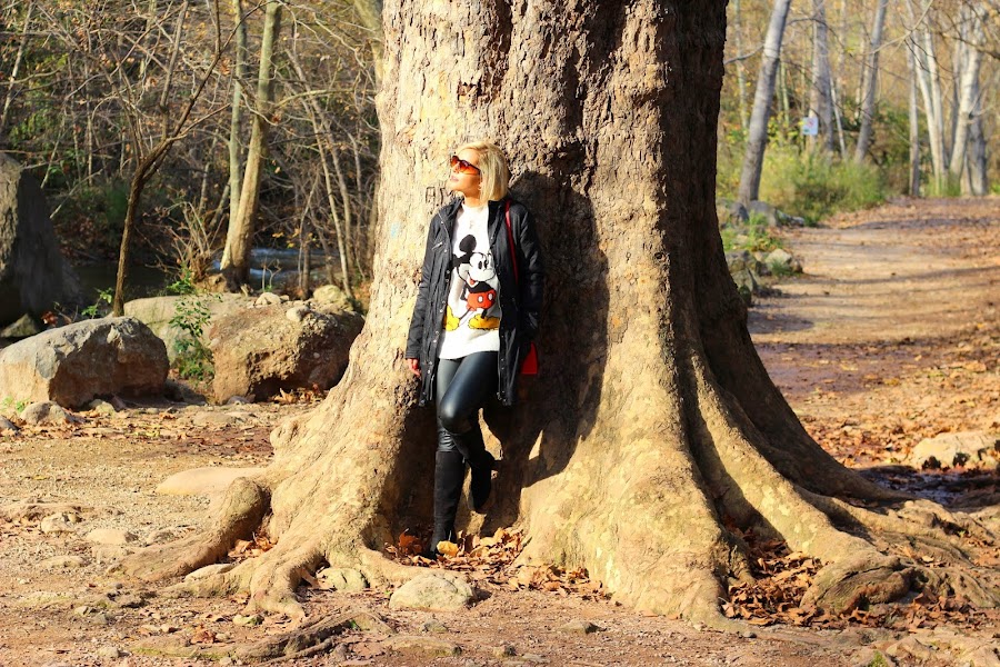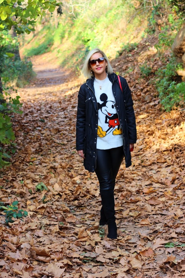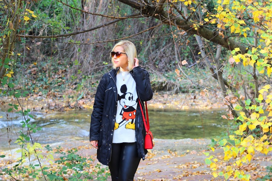 Today I show you a casual and comfy outfit. In the outfit of the day, I wear my new Mickey sweater that I loved it at first sight with a leather leggings and a black coat. The accessories of the outfit are black boots and to give a touch of color to the outfit, I add a red bag.