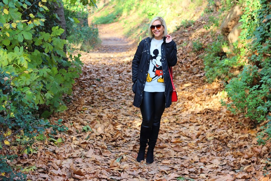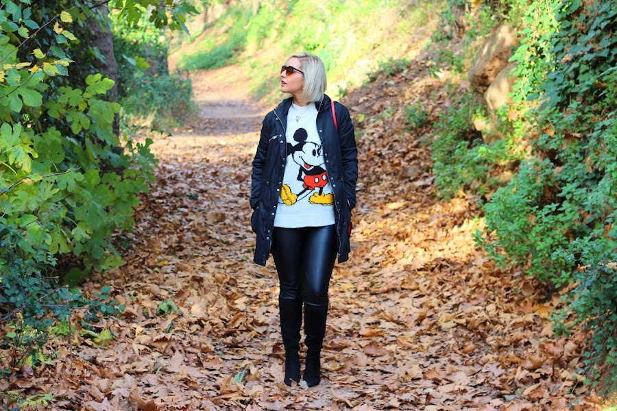 Hoy os traigo un look casual y super cómodo. En el look de hoy, llevo mi nuevo jersey de Mickey, que me encantó nada más verlo, que combiné con unos leggings de polipiel y un anorak negro. El resto de accesorios fueron unas botas altas negras y para darle un toque de color al look, le añadí un bolso rojo.