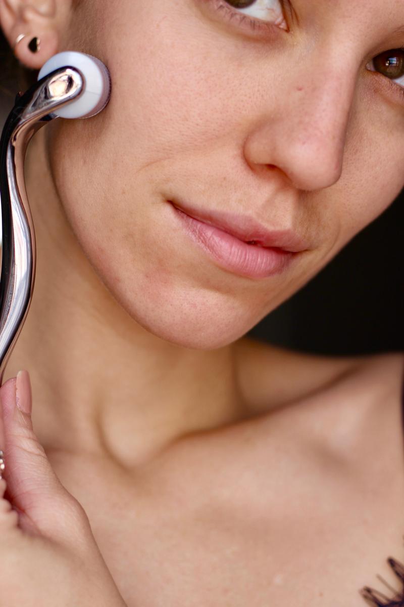 Rodar el Skin Roller por la piel durante 5 minutos aproximadamente en varias direcciones (vertical, horizontal y diagonales) y siempre en líneas rectas. No tengas prisa al realizar este paso. Nunca llegar a tocar la zona del contorno de los ojos y labios, son zonas más sensibles.