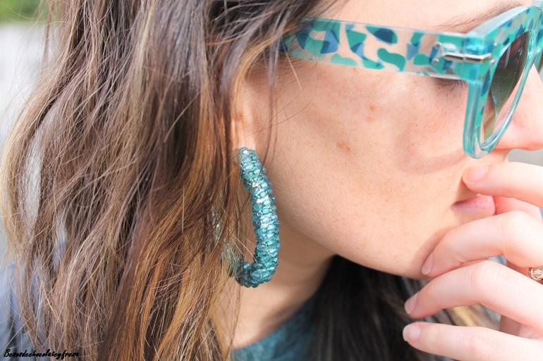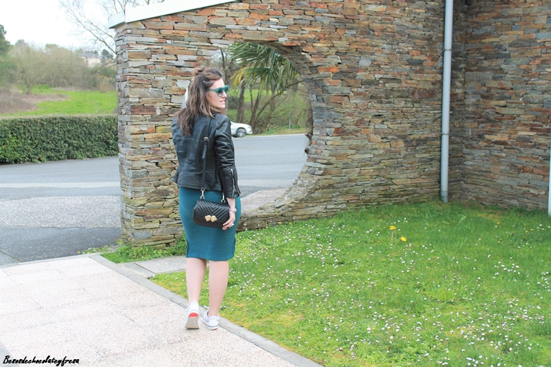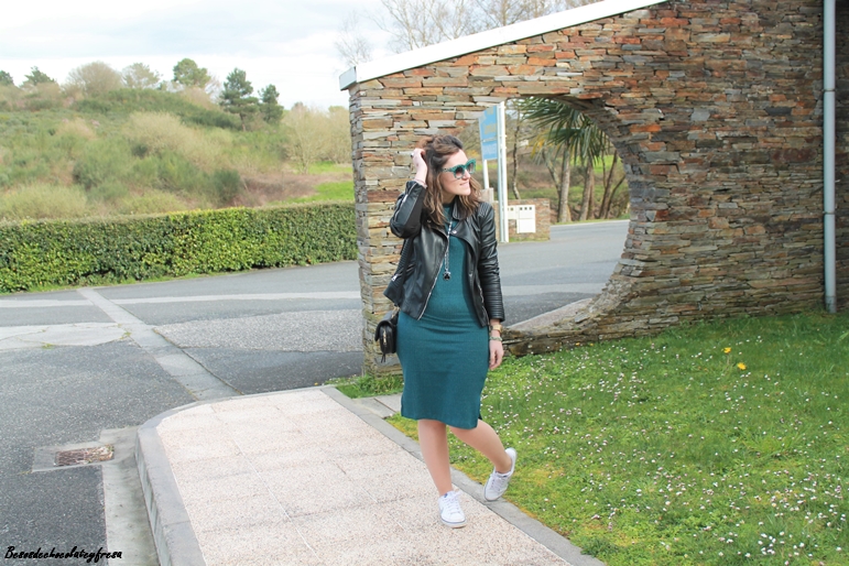 Para un look sport aposté por mi nuevo vestido entubado de canalé en verde turquesa de manga larga con deportivas y complementos en negro como son la biker de cuero, el bolso y joyas. Para seguir con el color turquesa aposté por pendiente de aro y strass y gafas a juego.