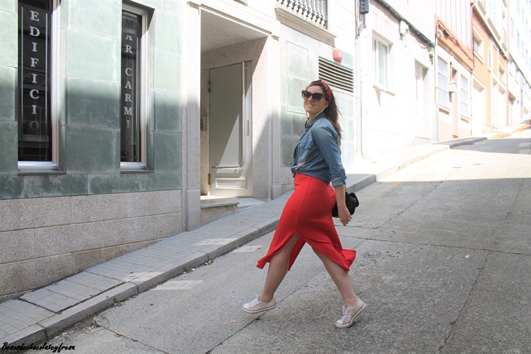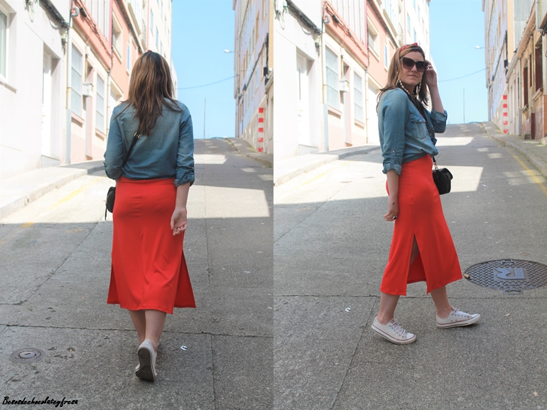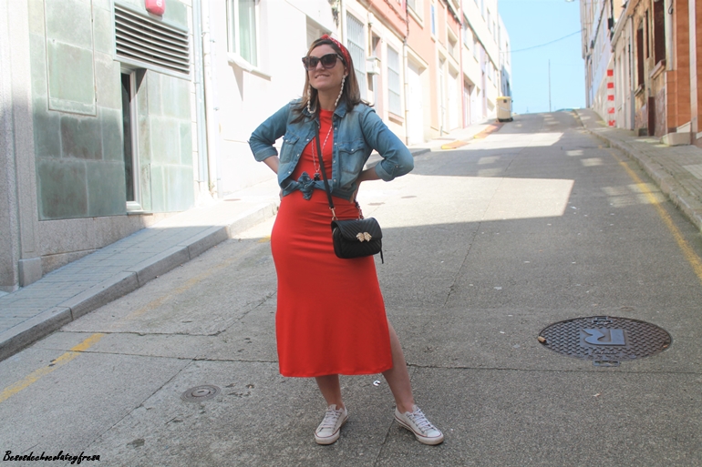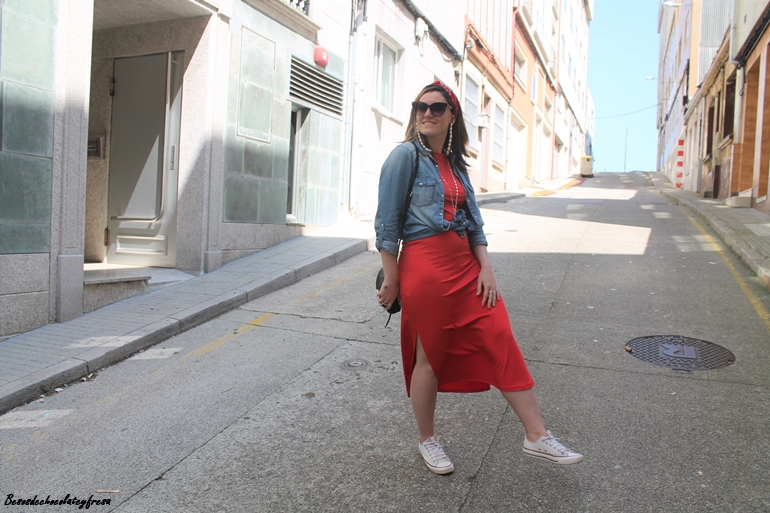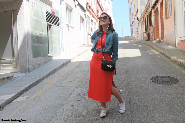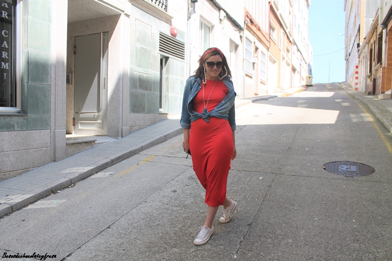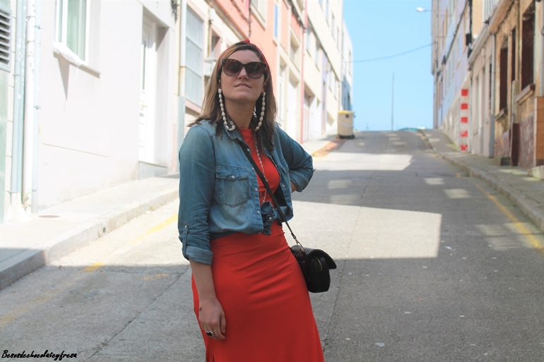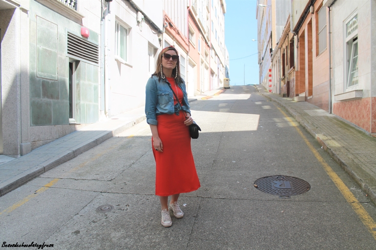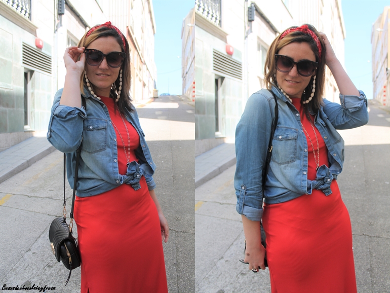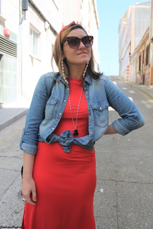 Esta vez aposté por añadirle una camisa denim a modo de chaqueta anudada en la cintura y abierta para que se puede ver bien el vestido de largo midi y en canalé, rojo pasión.