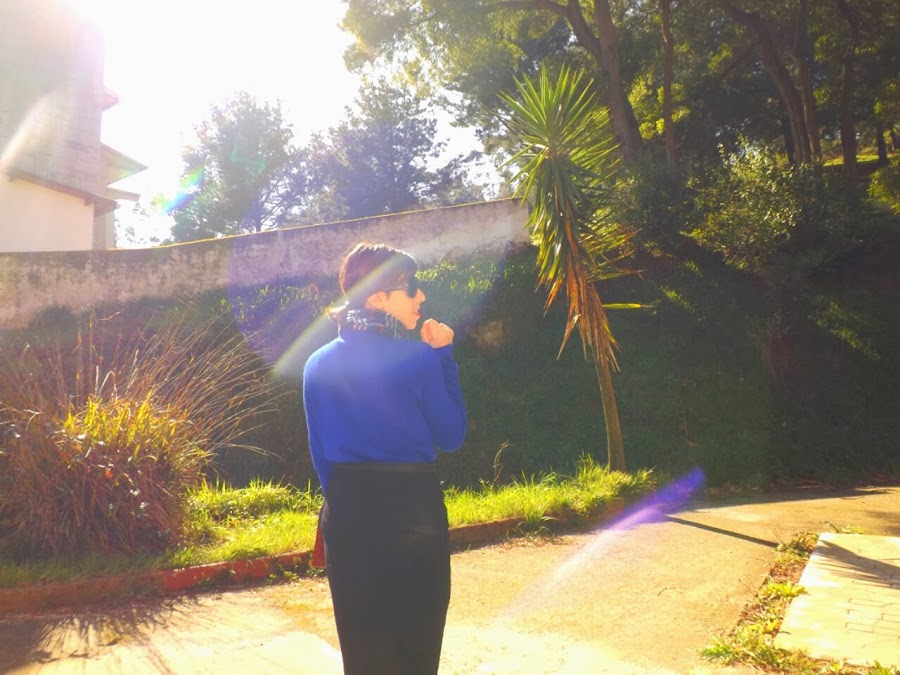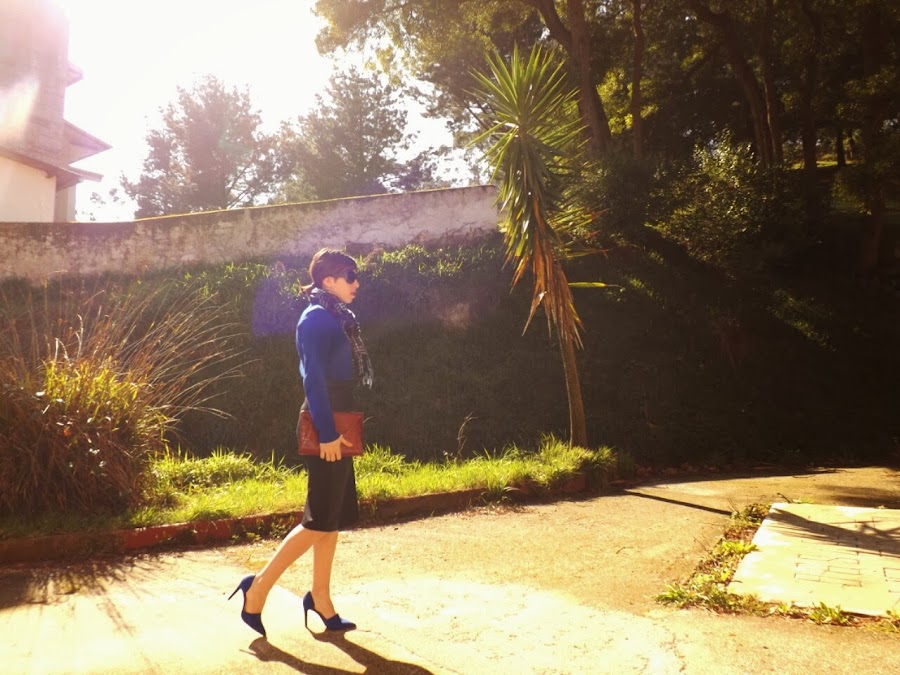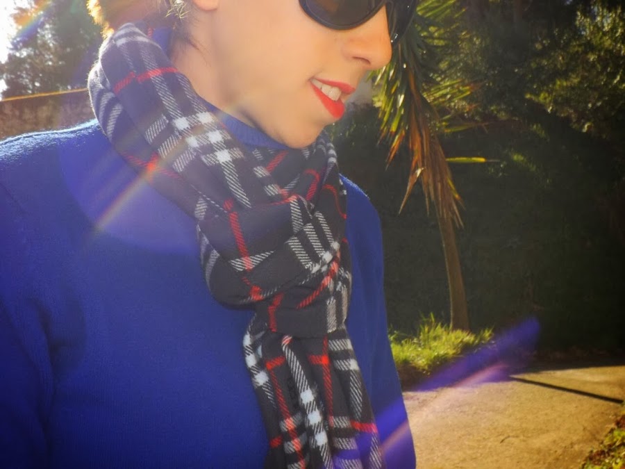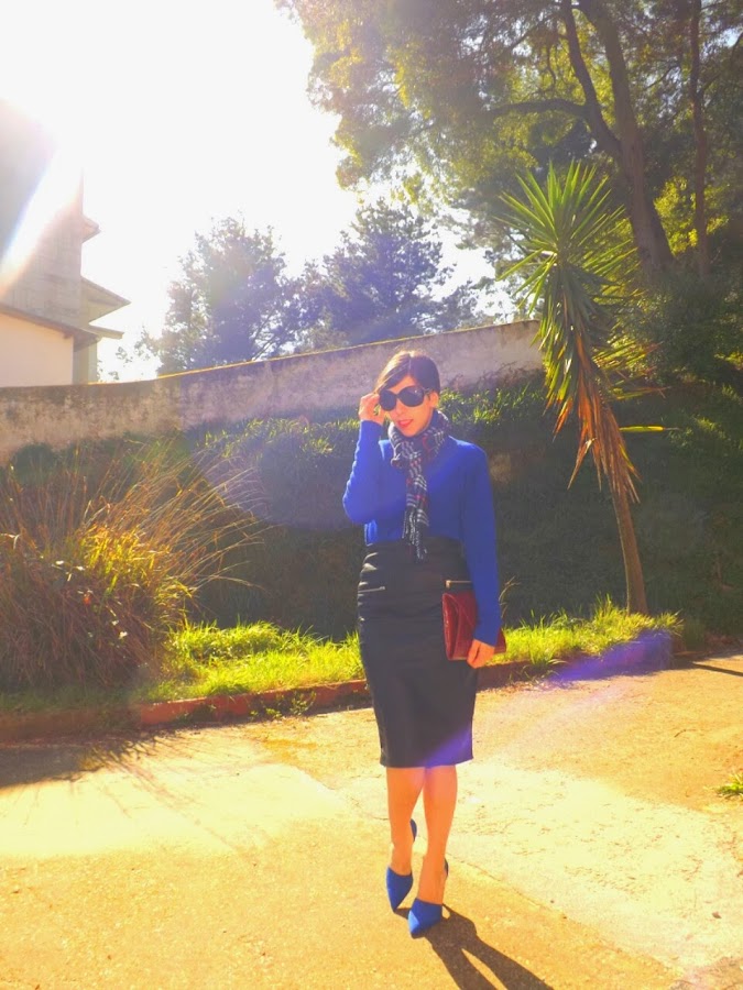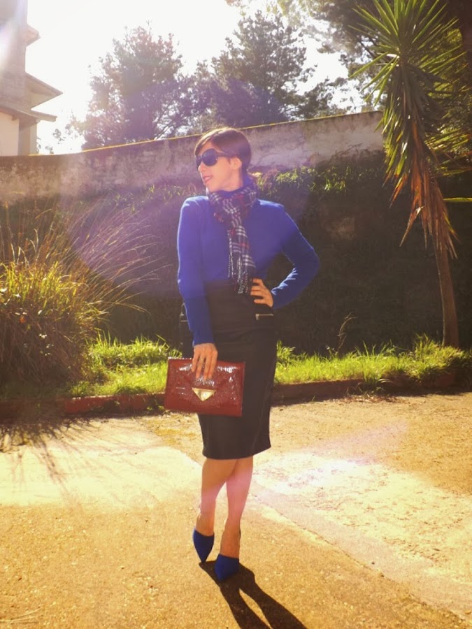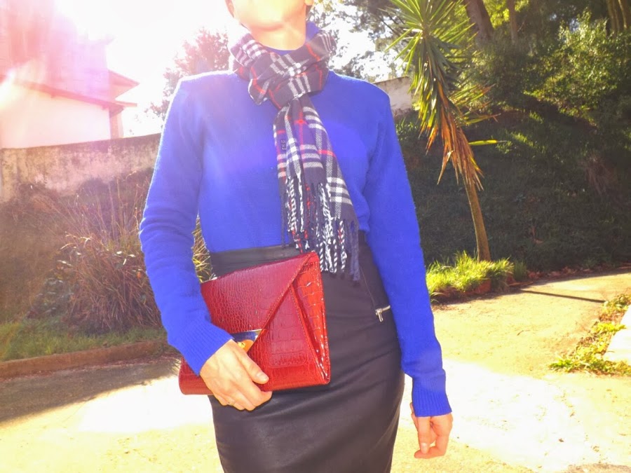 En este caso, la he combinado con jersey y zapatos en Azul Klein. El clutch rojo contrasta con el resto de prendas. Le he añadido esta bufanda porque reúne todos los colores anteriores.