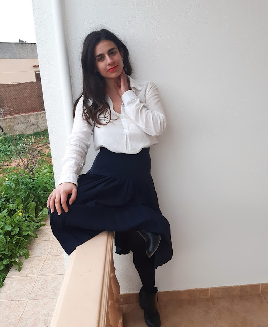 Buenos días, feliz semana. Un nuevo lunes nos espera y con mucha felicidad. Hoy en Baleares es festivo y aprovecharé para adelantar trabajo, hacer recetas que me apetece muchísimo. Mañana vuelta a la rutina de trabajo. El post de hoy será de un look muy años 50 que me encanta y que me lo puse para grabar un Tik Tok de Carnaval para la Curvy Squad Ibiza. Llevo una blusa blanca larga, falda midi, botines y medias negras. ¿Os recuerda este look a alguna protagonista de alguna película conocida? Contadme en comentarios, os leo.