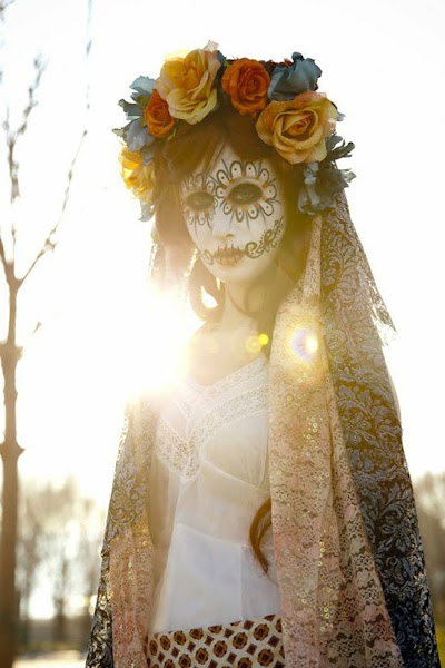 Para nuestra primera idea no necesitas muchos complementos. Unas flores de plástico para hacer una corona, unos pañuelos largos para el velo, alguna prenda estilo camisón y un poco de maña para pintar los detalles del maquillaje. Eso sí, avisa que vas de novia cadáver si no quieres matarles del susto cuando abran la puerta :P.