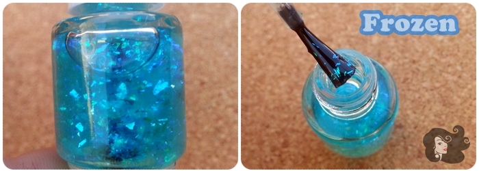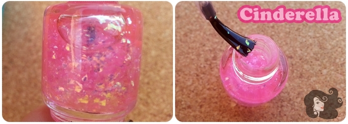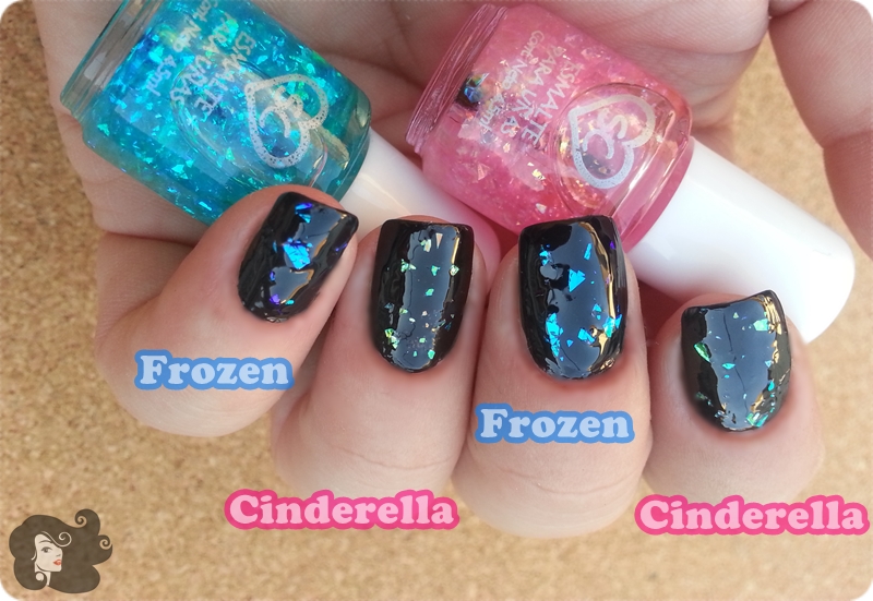 Crystal CinderellaLos Flakies de Cinderella son más pequeños que los de Frozen y le dan al esmalte un acabado super delicado, al igual que su compañero la base de suspensión tiene una leve tonalidad, en este caso rosada, a Cinderella también lo probé sobre negro y el resultado me gustó mucho, lo loco es que a diferencia de su compañero en las uñas no se ve rosa, sino una mezcla de colores que pasa entre un verdoso, dorado y rosa.