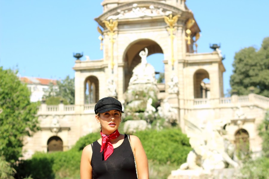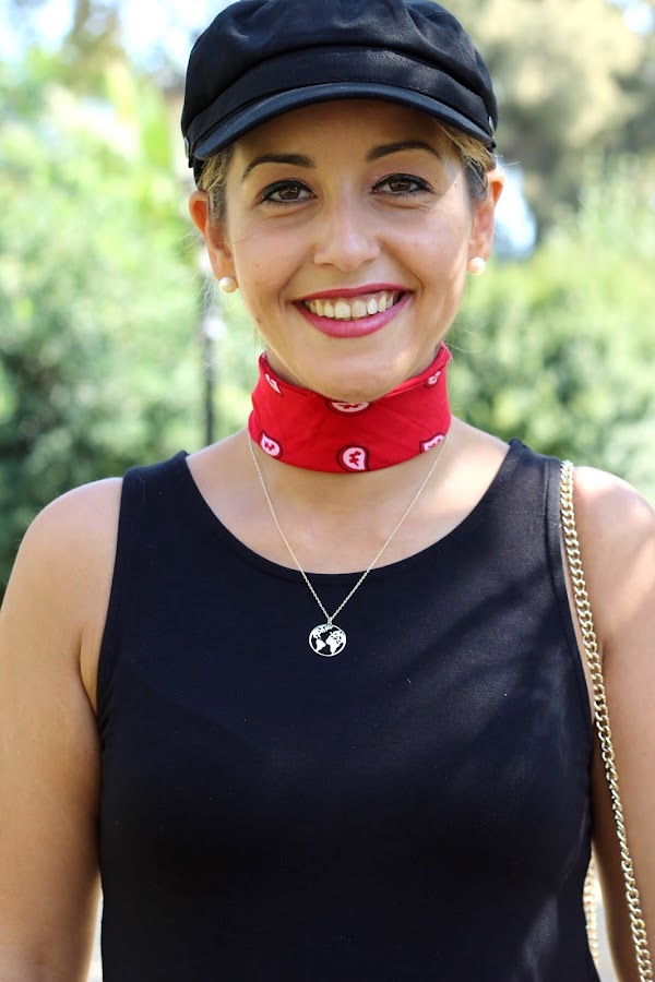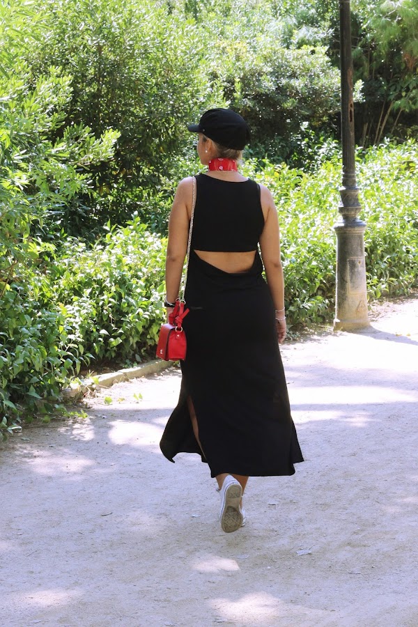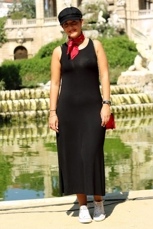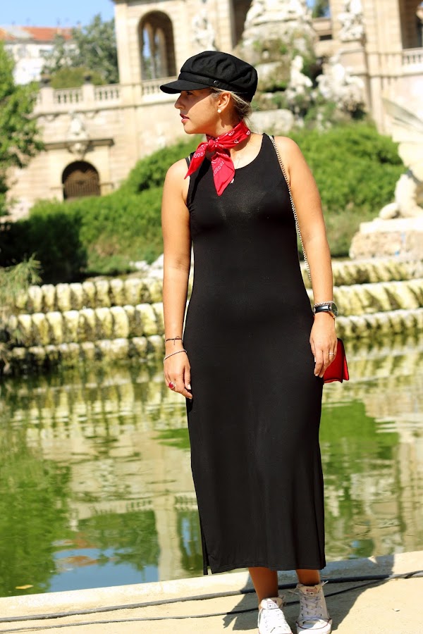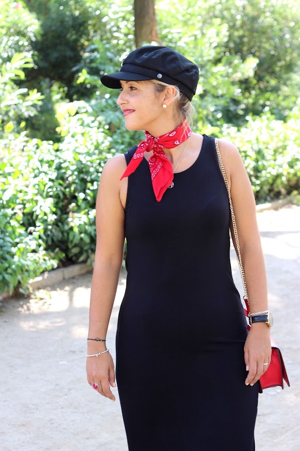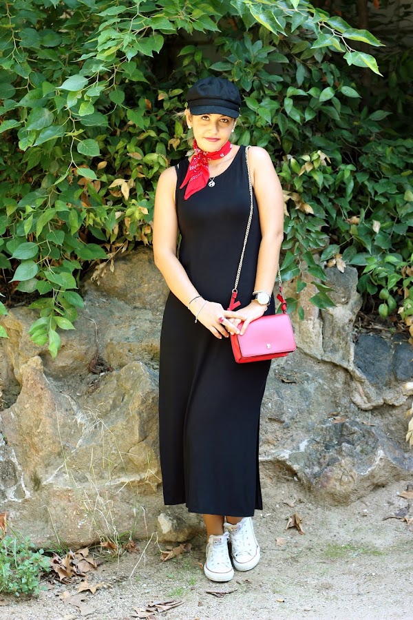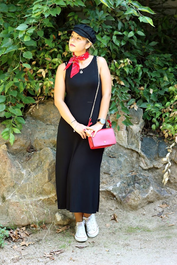 Hoy os enseño un look casual chic con una de las tendencias de la temporada: la gorra militar. Aprovechando los últimos días de calor, decidí ponerme un vestido negro largo que combiné con una chaqueta verde militar, que son super tendencia esta temporada. Como accesorios, escogí una bandana roja que le da un toque genial al look, mi nueva gorra militar, un bolso rojo y mis converse.