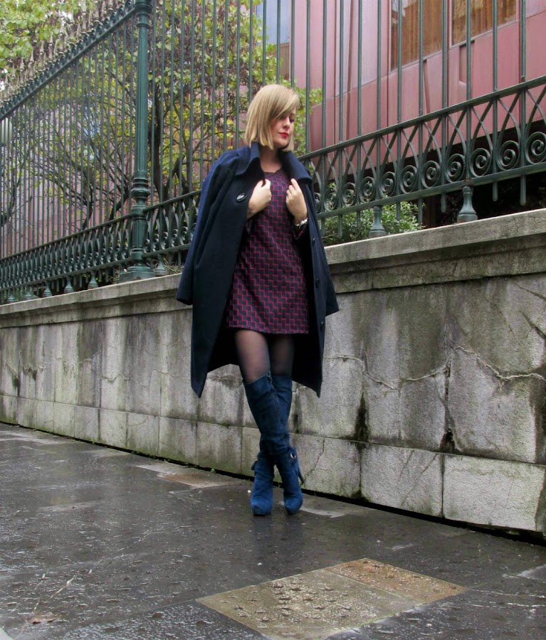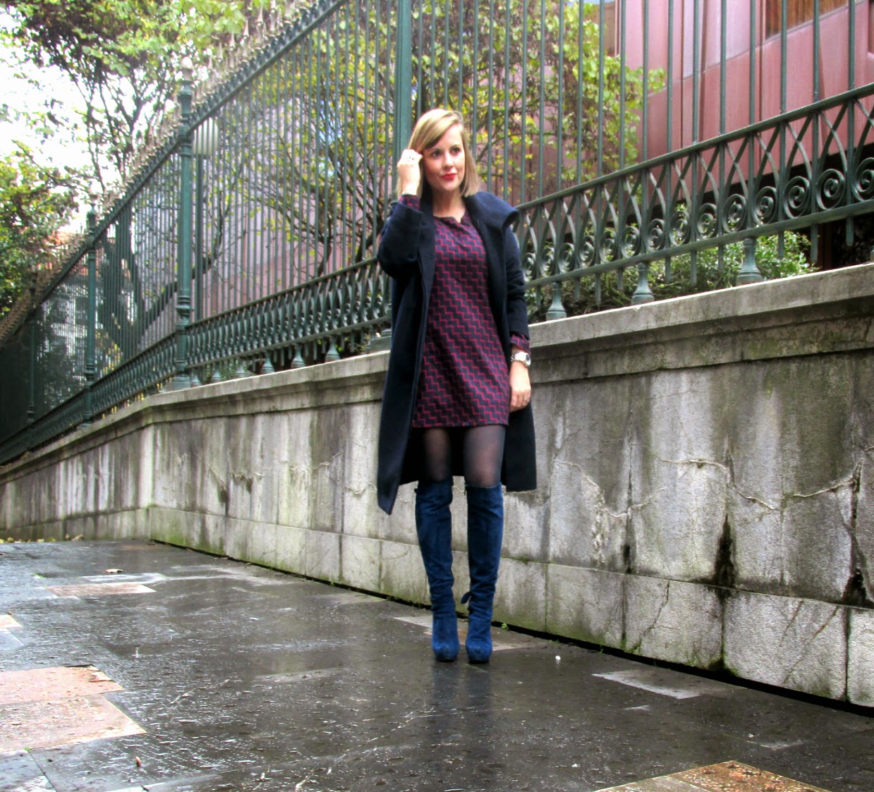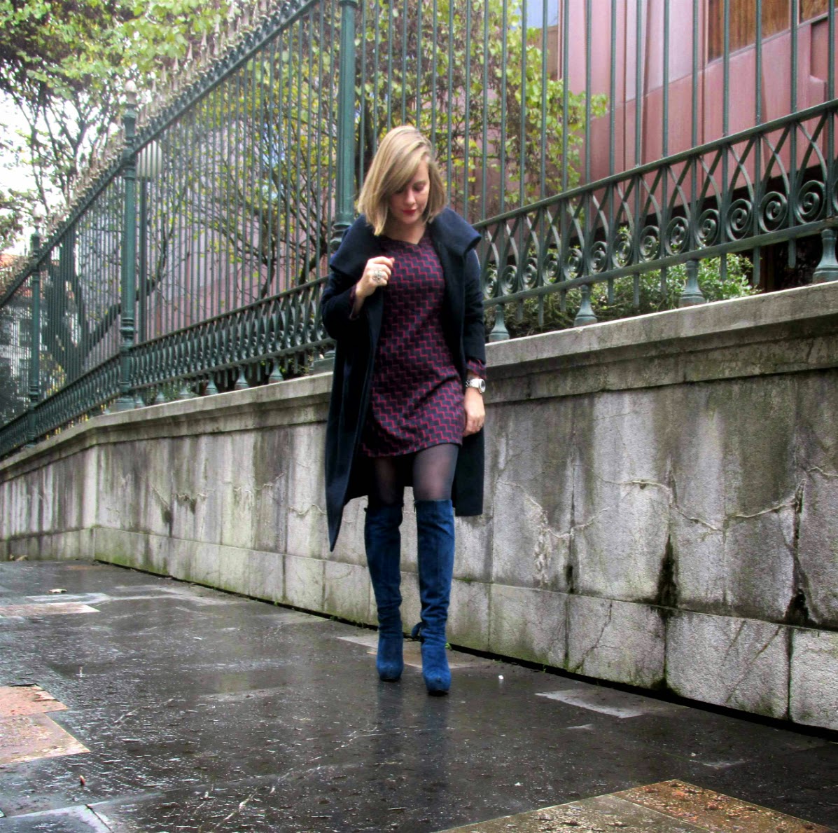 Un mini vestido con aires retro no necesita mucho mas para conformar un bonito look. Siguiendo la línea de aires sesenteros lo combiné con unas botas altas y un abrigo amplio.
