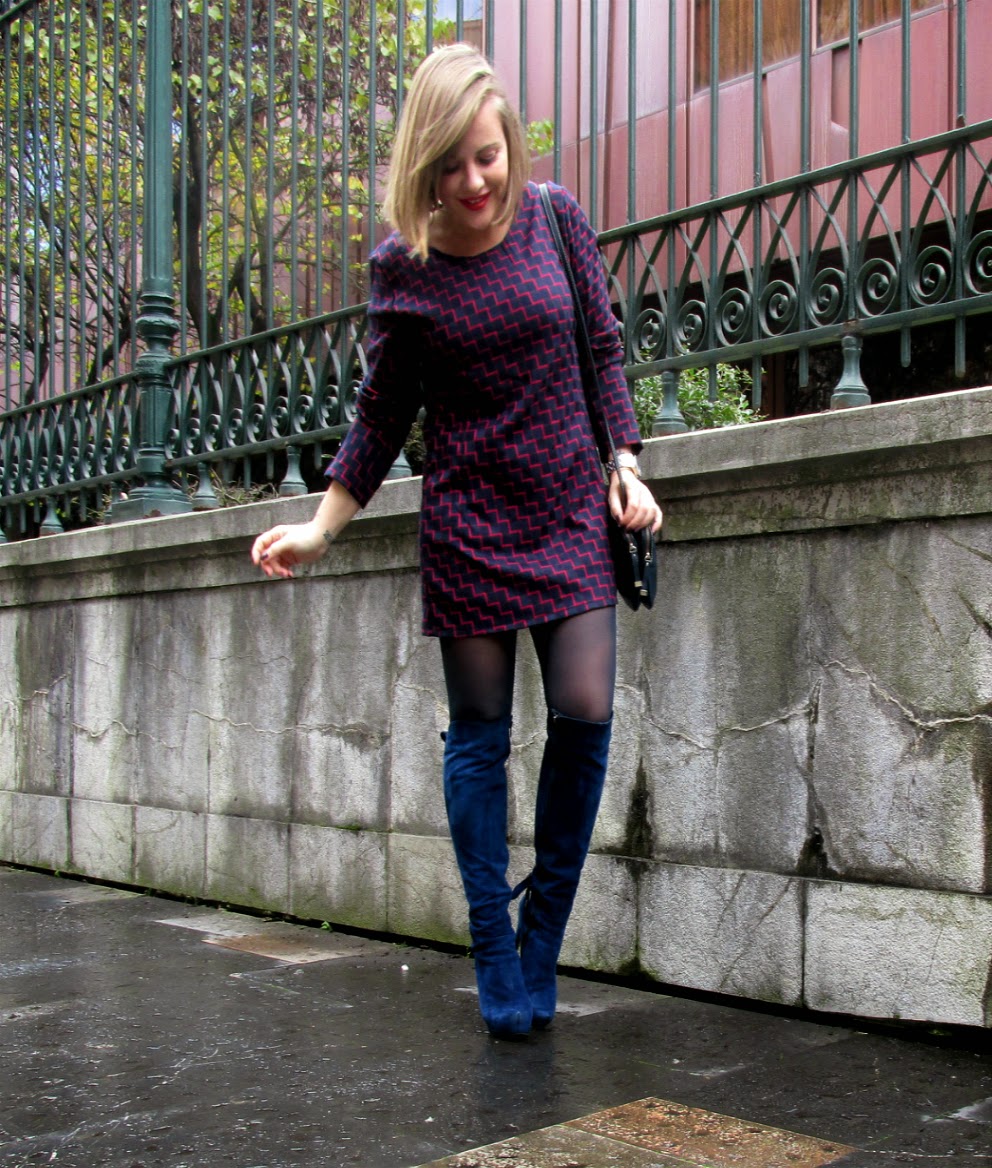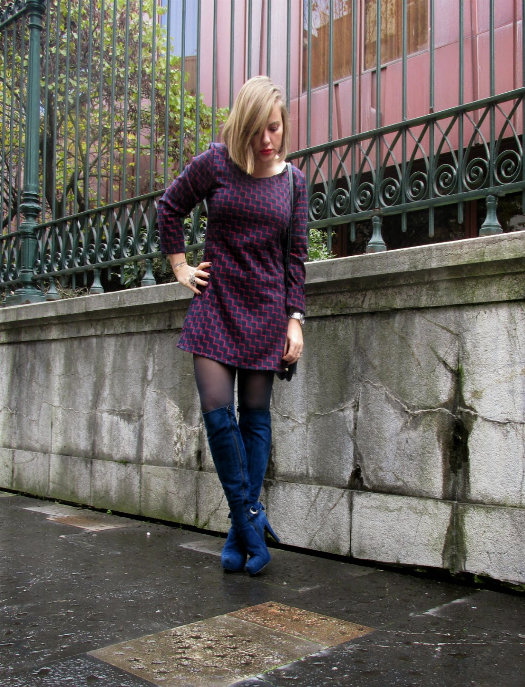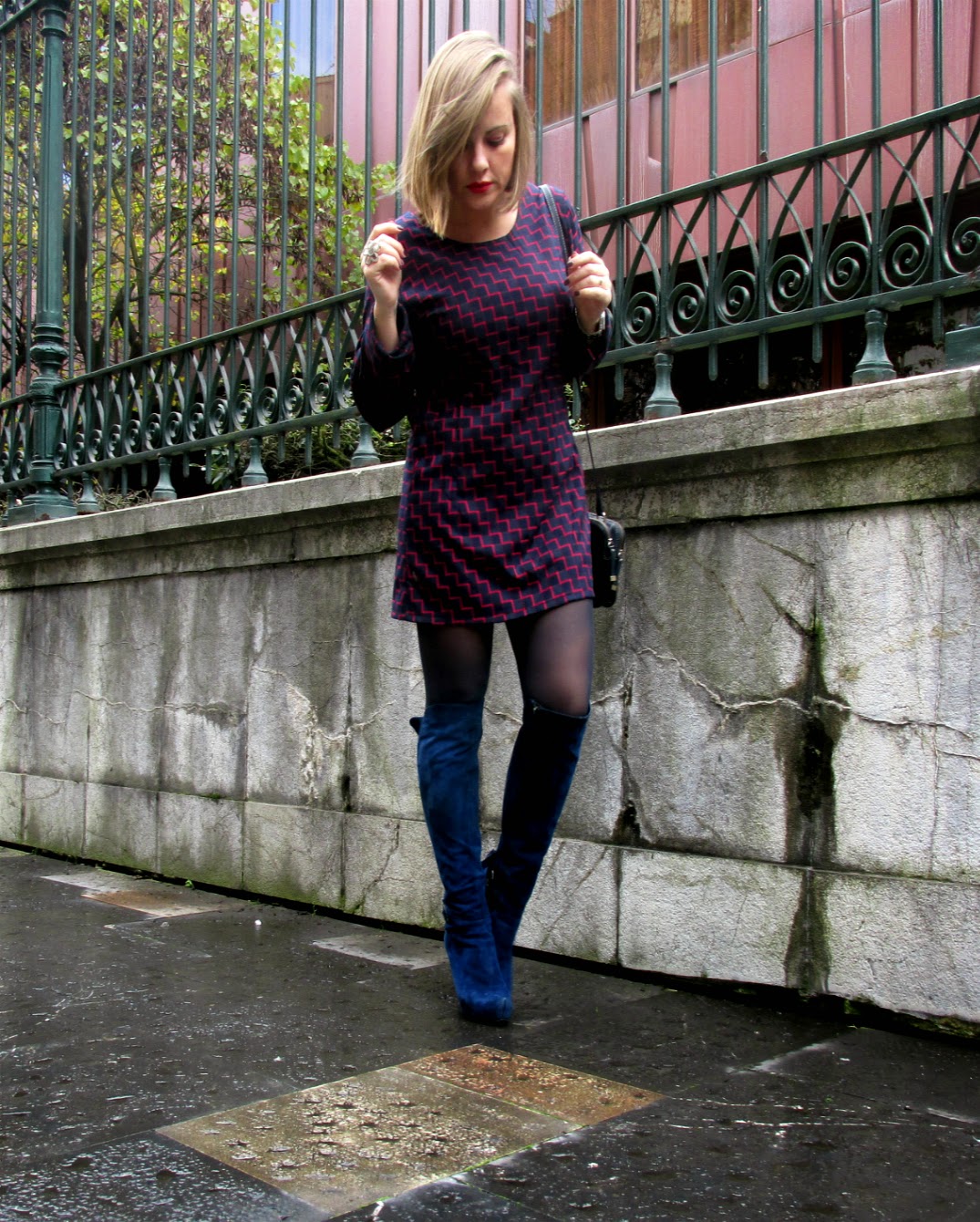 Un mini vestido con aires retro no necesita mucho mas para conformar un bonito look. Siguiendo la línea de aires sesenteros lo combiné con unas botas altas y un abrigo amplio.