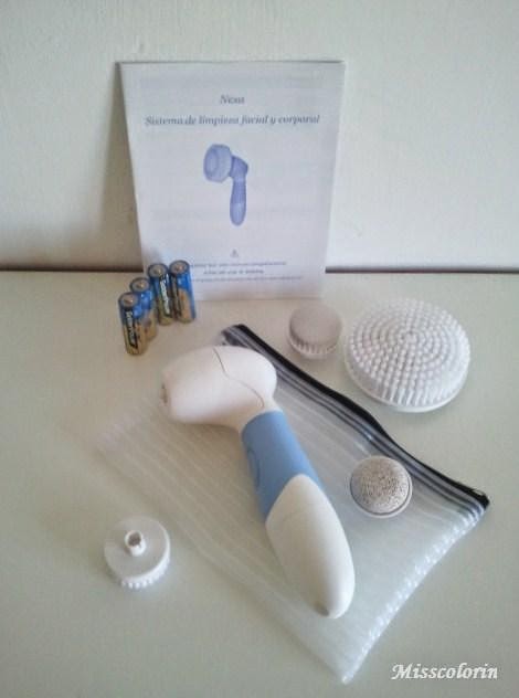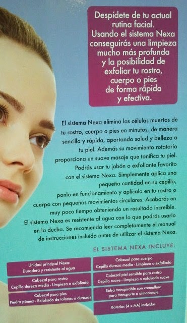 No tenía ningún cepillo de este tipo y me apetecía probar uno. Escogí el Nexa porque no sólo sirve para la limpieza facial (no es muy caro, pero como una semana después de comprarlo, lo pusieron al 50%... ¡grrrrr!). En las instrucciones y características que os he puesto en la segunda imagen se puede observar para qué sirve y cómo usarlo. Básicamente es un sistema rotatorio automatizado de limpieza y exfoliación para la piel. El pack incluye el mango, 4 cabezales, manual de instrucciones, un juego de 4 pilas (cosa que se agradece para poder usarlo desde el minuto uno, jaja) y un neceser para guardarlo todo.