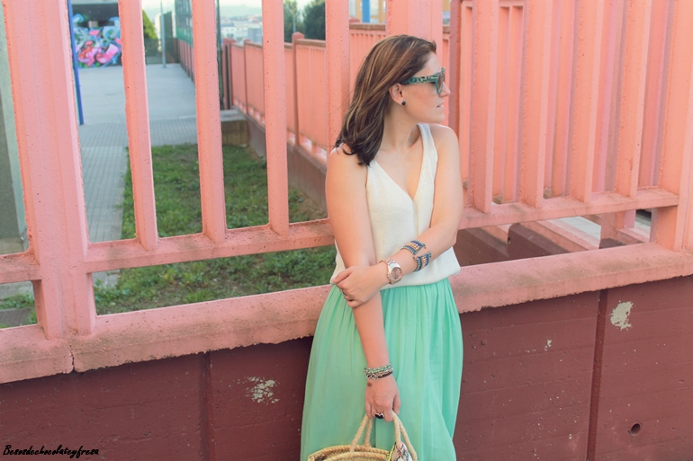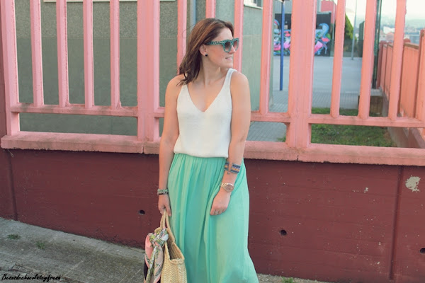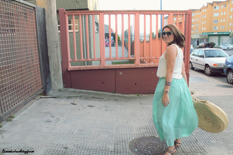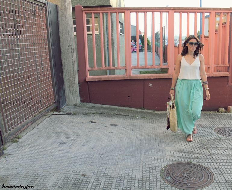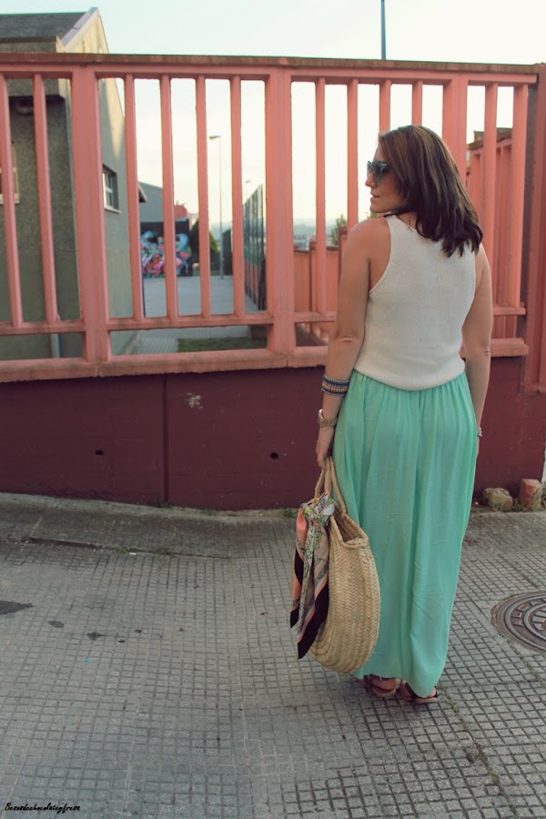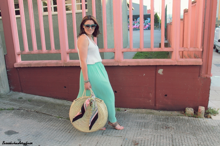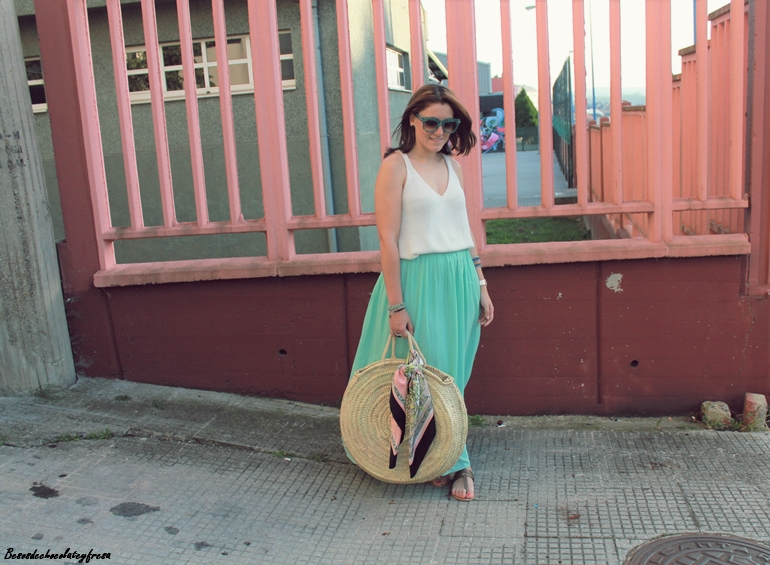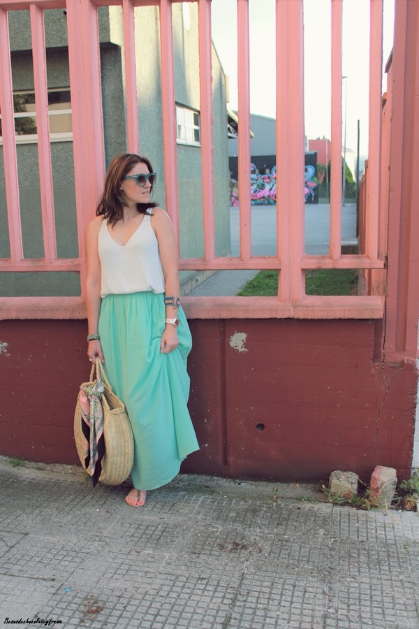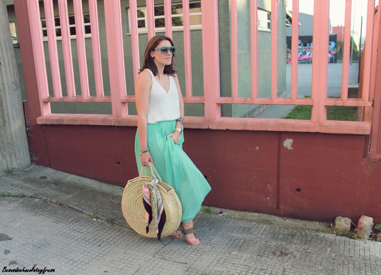 Maxi falda en verde mint que ya me pudisteis ver en estos otros dos post (casi a comienzos del blog, AQUÍ y AQUÍ) pues esta falda es de esas que año tras año no pasan de moda y tiene un montón de tiempo en mi armario. Camiseta de tirantes blanca de punto, sandalias, capazo con detalle de pañuelo vintage atado y gafas con print divertido completan el look.