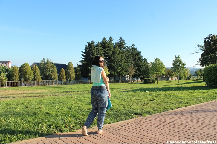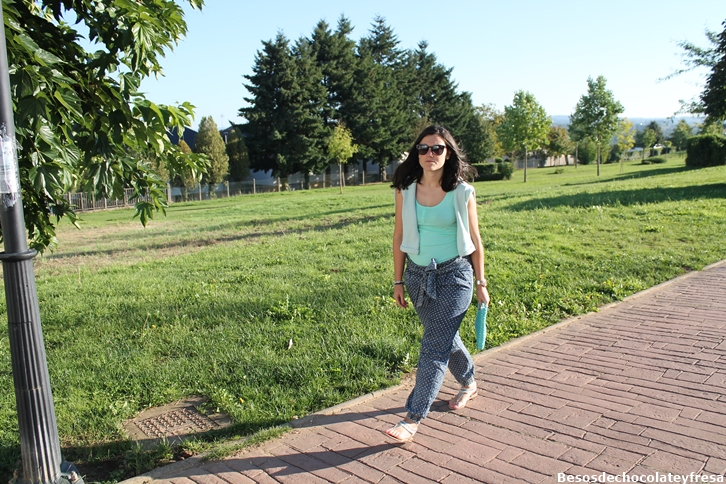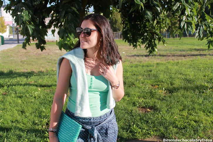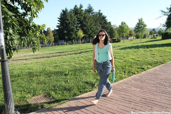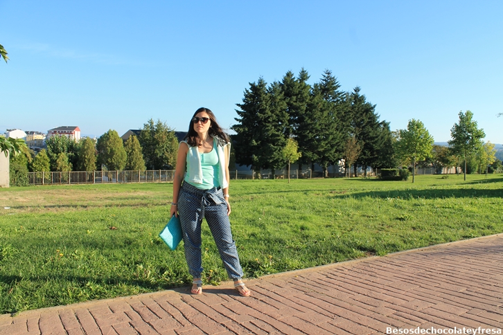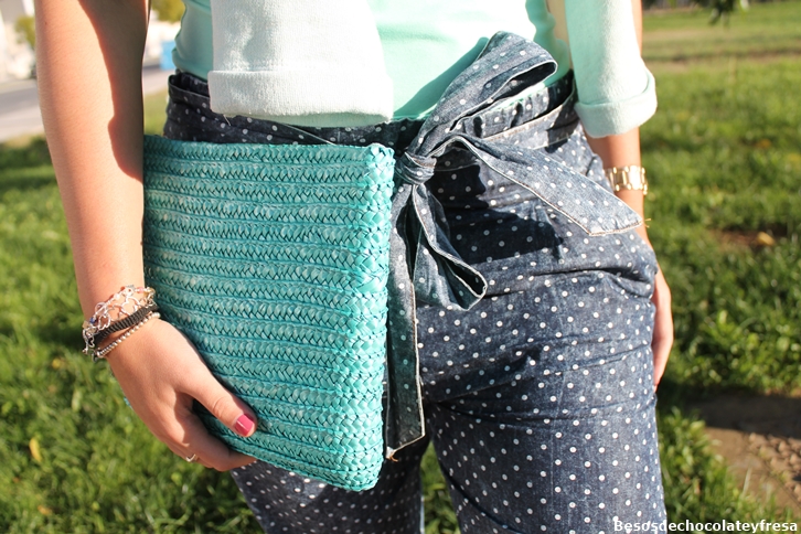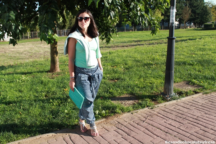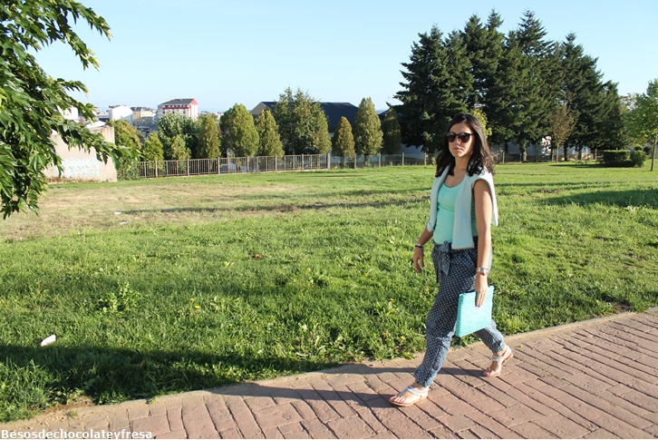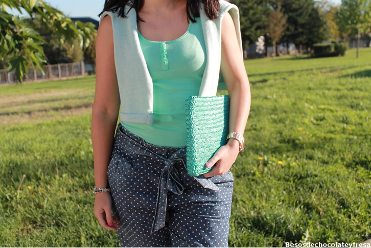 En este look aposté por pantalones baggy imitando a jeans con topos blancos y lazada, camiseta de tirantes color mint a juego con la sudadera y el clutch de rafia.
