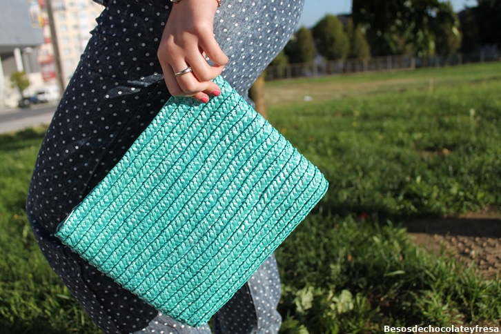 In this look I bet by imitating jeans baggy pants with white polka dots and loop, mint colored tank top with matching clutch sweatshirt and raffia.