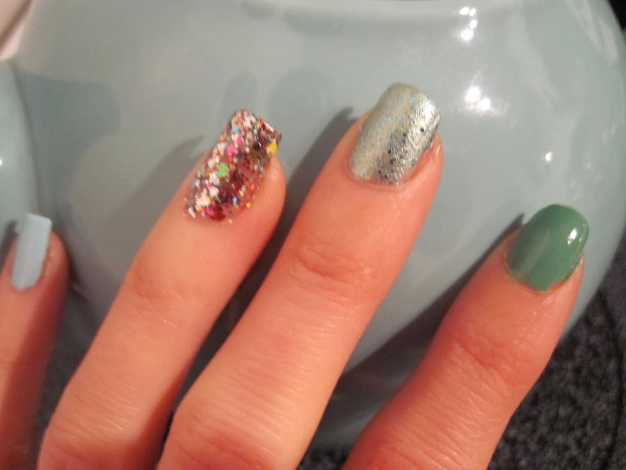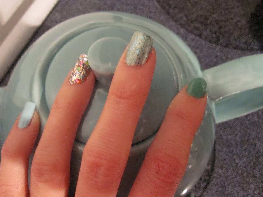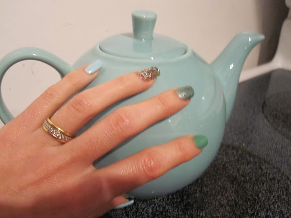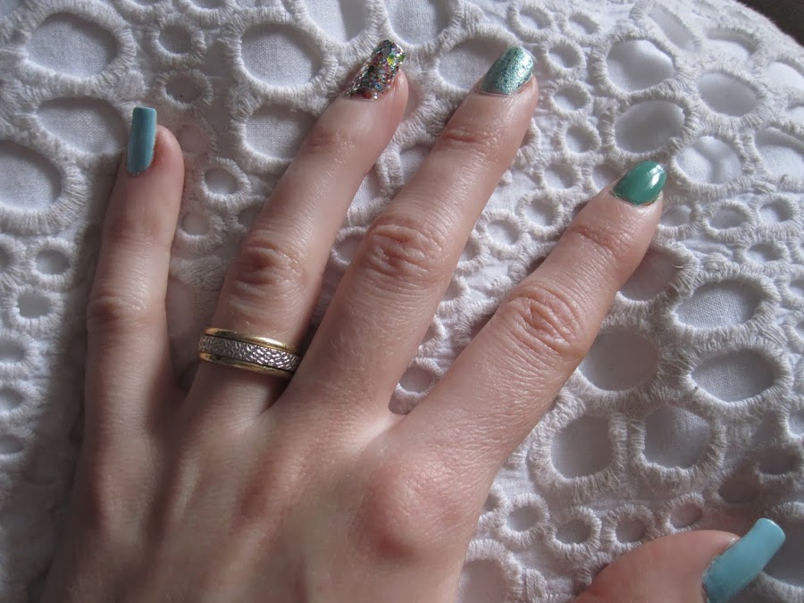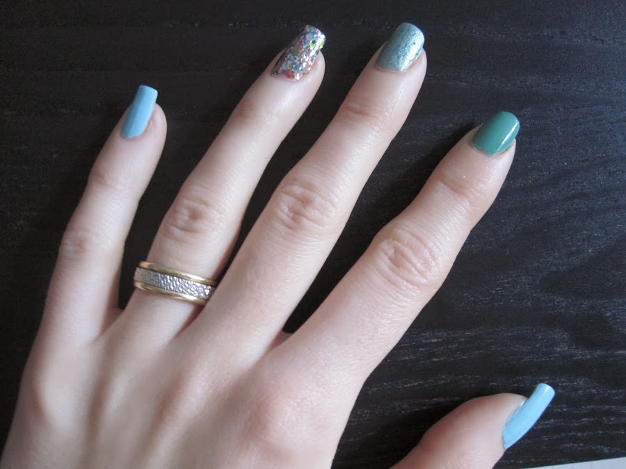 Me encanta el color Tiffany, el menta y los de esa gama de colores, por eso que tengo tantos esmaltes de estos tonos. Ayer se me ocurrió que podría quedar original crear una gama de estos tonos en mis uñas y que tal vez incorporar un poco de brillo y purpurina en el anular le daría un toque aun mas divertido, aparte el glitter esta muy de moda y es muy apropiado para ir de fiesta, además de dar un efecto joya a tus dedos.