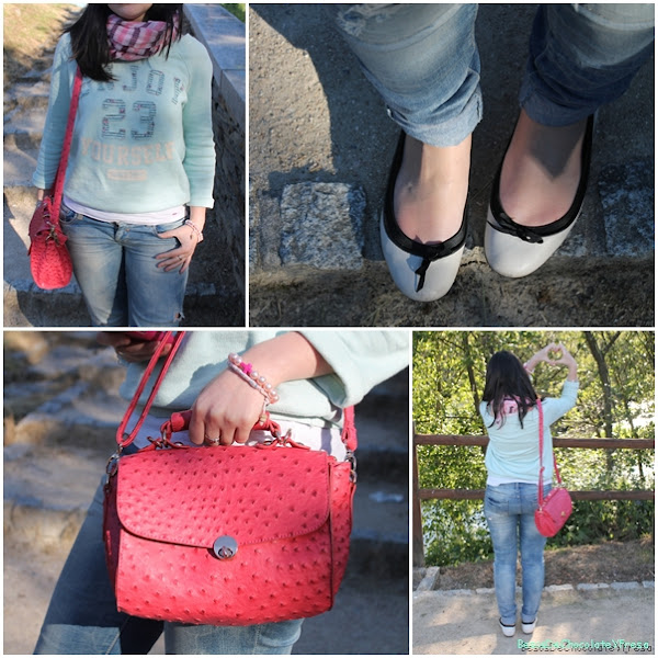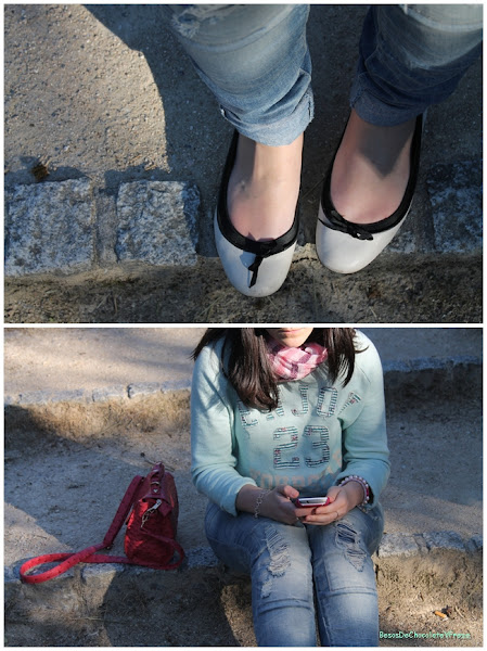 Como complementos opté por dar color y aposté por un bolso rosa con piel de avestruz que ya os enseñe en blog de una tienda local, para que hiciera contraste con la sudadera, pues también tiene algún motivo de ese color, bailarinas blancas de Zara de hace varios años y fular rosa de Blanco.