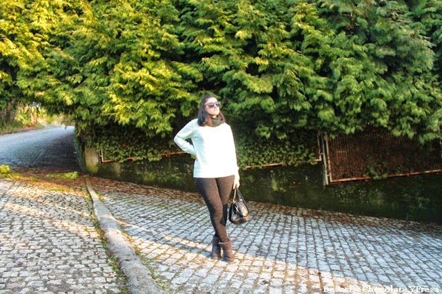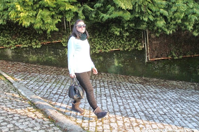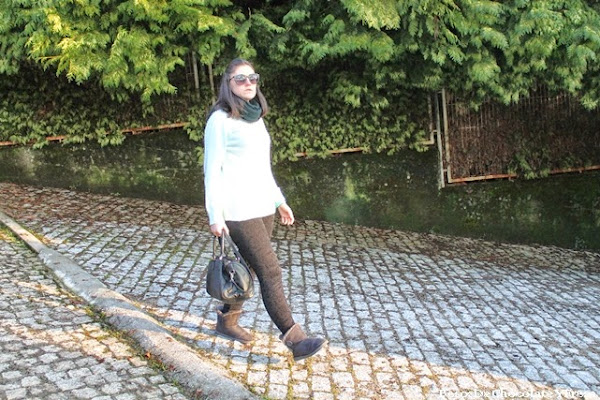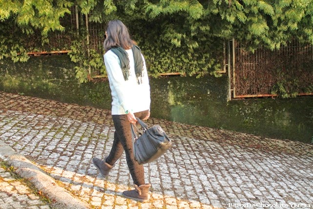 Today I show a look with my new sweater in green mint. Super abrigosito and brillates simulating neck collar. I combined it with leggings in black brocade effect, Ugg type boots dark gray scarf and black tote bag.