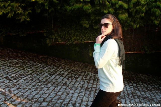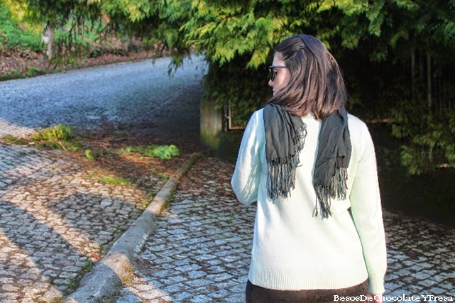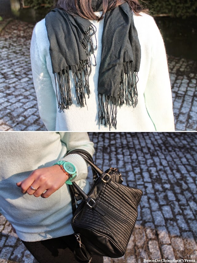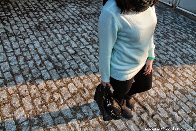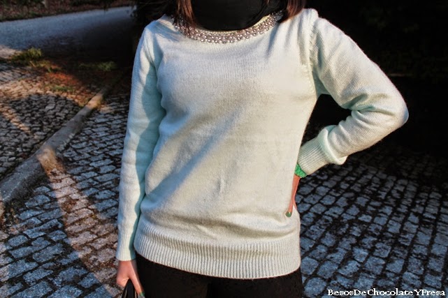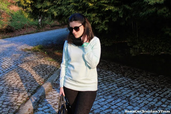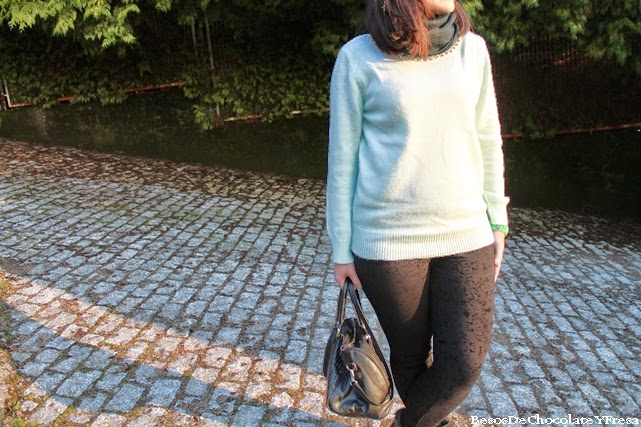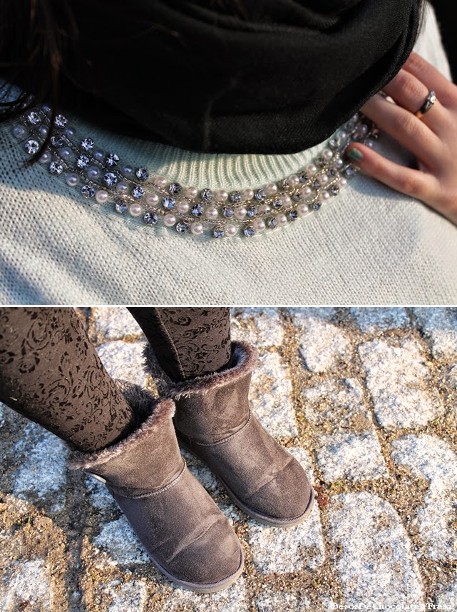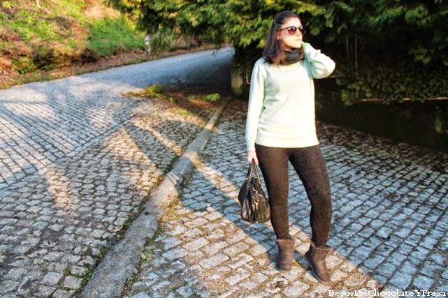 Hoy os enseño un look con mi nuevo sweater en verde mint. Super abrigosito y con brillates en el cuello simulando un collar. Lo combiné con leggings efecto brocado en negro, botas tipo Ugg en gris oscuro, fular y bolso tote negro.