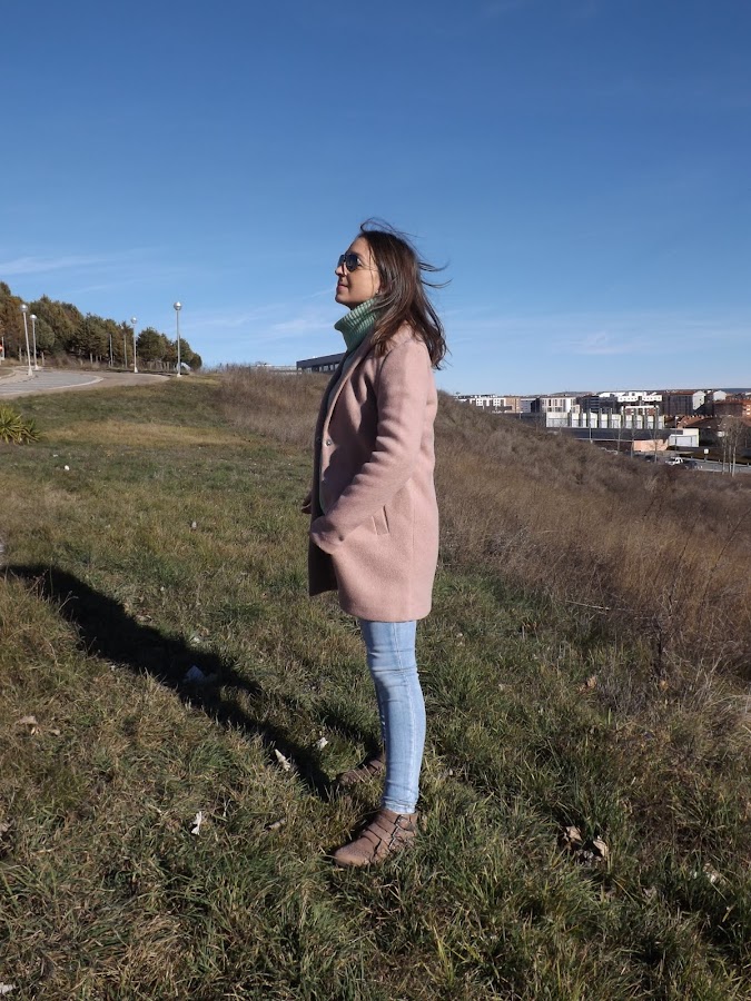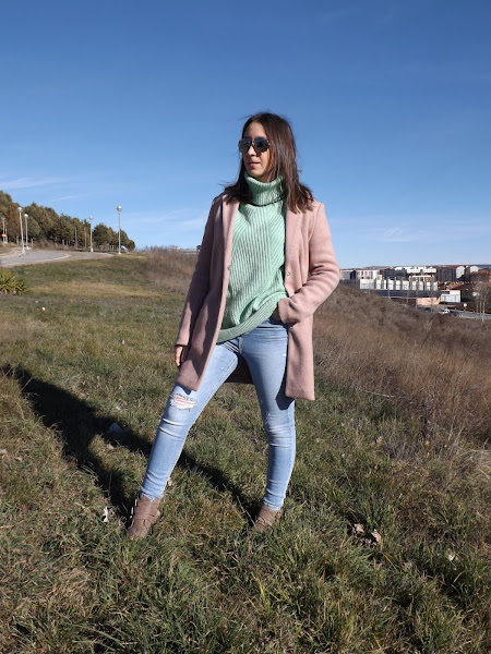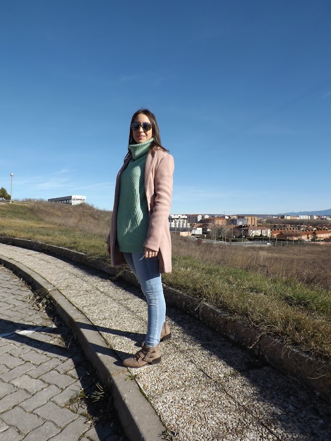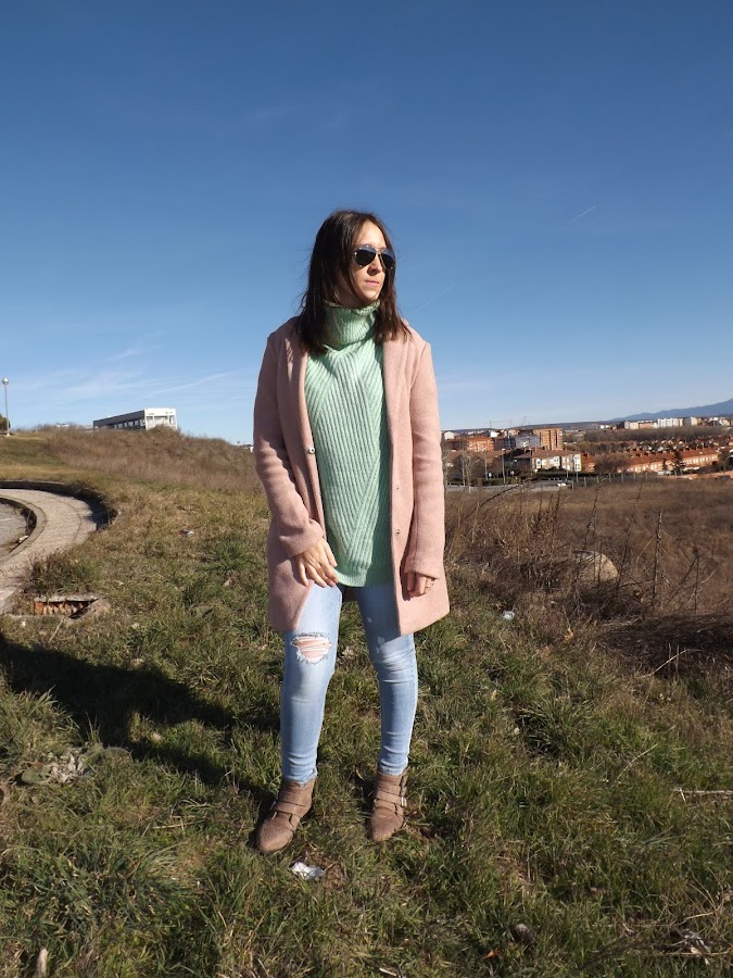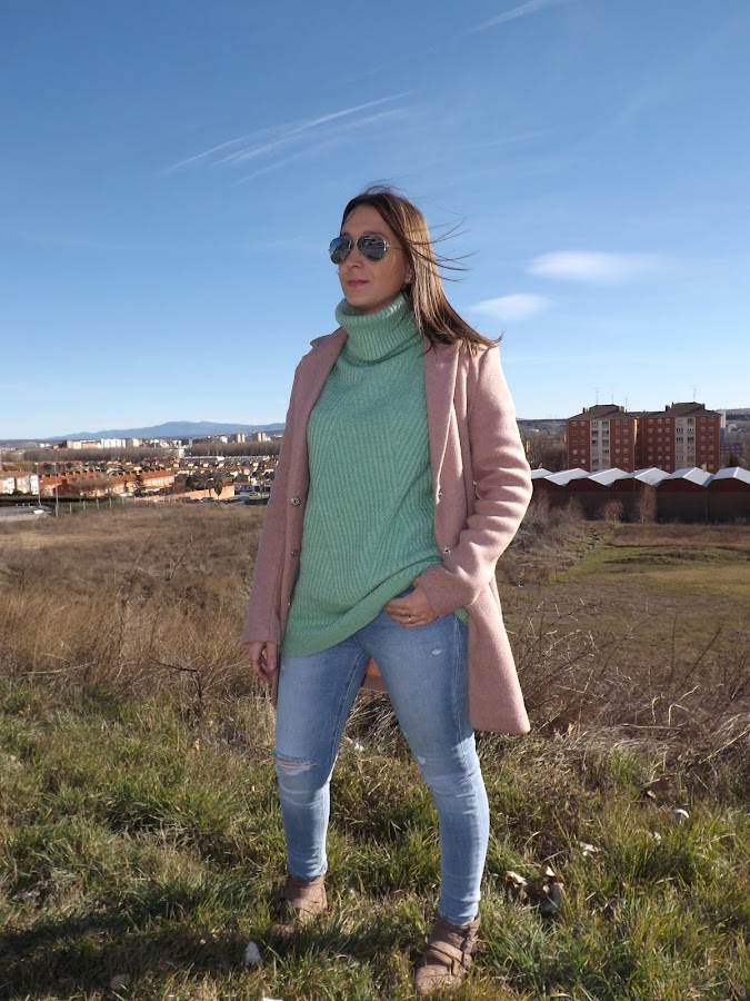Todas las prendas son de nueva temporada, el abrigo rosa es de Springfield y tanto el jersey como los jeans, de Stradivarius.