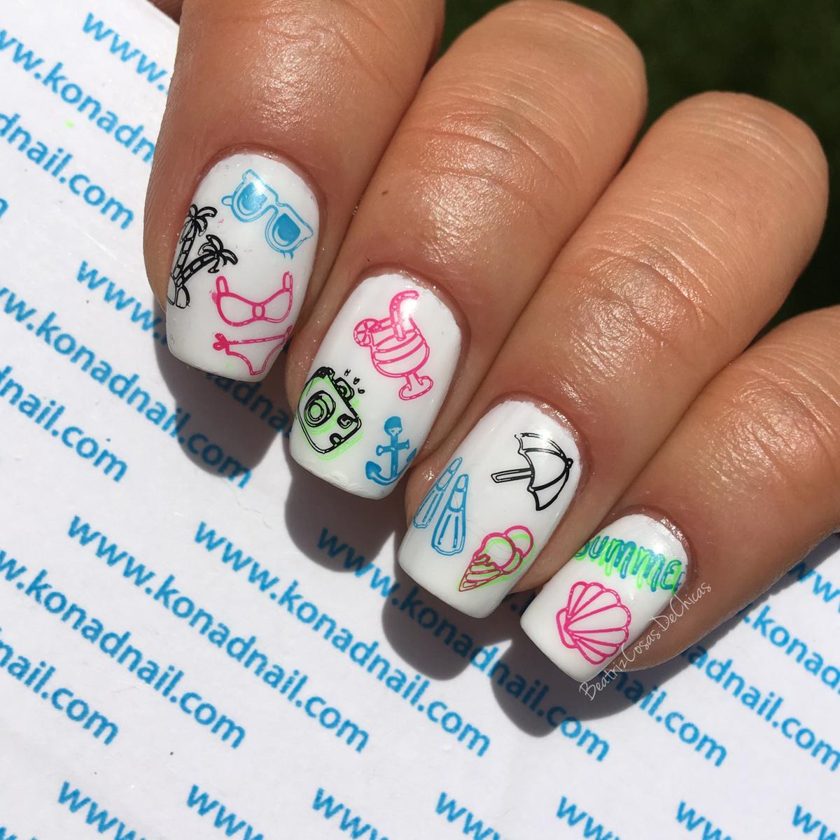 Que tal estáis?!?! Seguro que algunas me estáis leyendo ya de vacaciones…otras ya las habéis pasado y otras como yo estamos con un ansia viva que no se puede soportar!!! jajajaja en fin, esteis de una manera o de otra…hoy os voy a enseñar 3 manicuras ideales para este verano y cada una diferente a las otras dos….las tres manicuras las he realizado con una misma placa de Konad que si no conocéis….no se a que estáis esperando porque es FANTÁSTICA…queréis ver mis 3 manicuras veraniegas con Konad?!?!?! Venga, vamos a verlas! Hoy os prometo un post rápido y muy visual…lo primero que voy a hacer es dejaros la placa que me tiene tan encantada. Para mi es una placa muy completa dado que tiene diseños completos para toda la uña como diseños pequeños para simplemente dar un toque de verano a la uña….ademas los diseños son variados, en esta misma placa se funden diseños clásicos de toda la vida con otros mucho mas modernos, ademas que tienen también hojas, motivos marineros, playeros….de verdad que creo que esta placa cumple todos los requisitos….sin contar que Konad es una de las mejores marcas de placas y productos para la Estampación y es un acierto…porque nunca falla! Aquí os dejo los diseños que hice de la placa en los Swatches de presentación: Swatches Placas Rectangulares de Konad