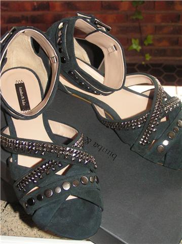 Eso sí en BIMBA&LOLA me topé con estas irresistibles sandalias, con cierto aire punk que desenvolví para empezar a crear estilismos: con minifalda de volantes en blanco,cinturón negro y una camiseta gris de tirantes.....con el vestido sesentero bordado de LAVAND (versión en negro del de la foto que es el que tengo)......