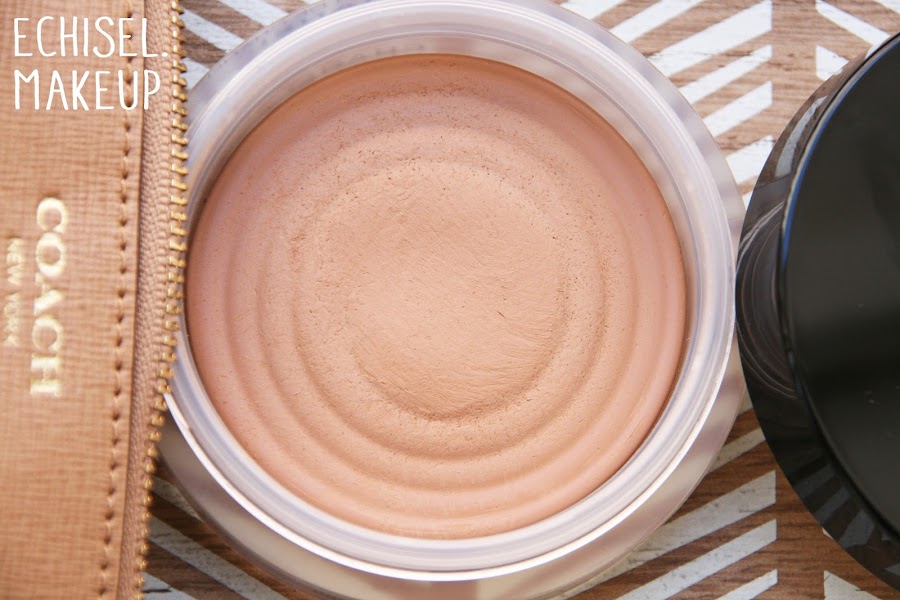 Tiene un color marrón tostado anaranjado con pequeñas partículas doradas. La textura del producto es densa y compacta, pero a su vez es suave y fácil de aplicar. Se difumina muy fácilmente y es fácil de modular.