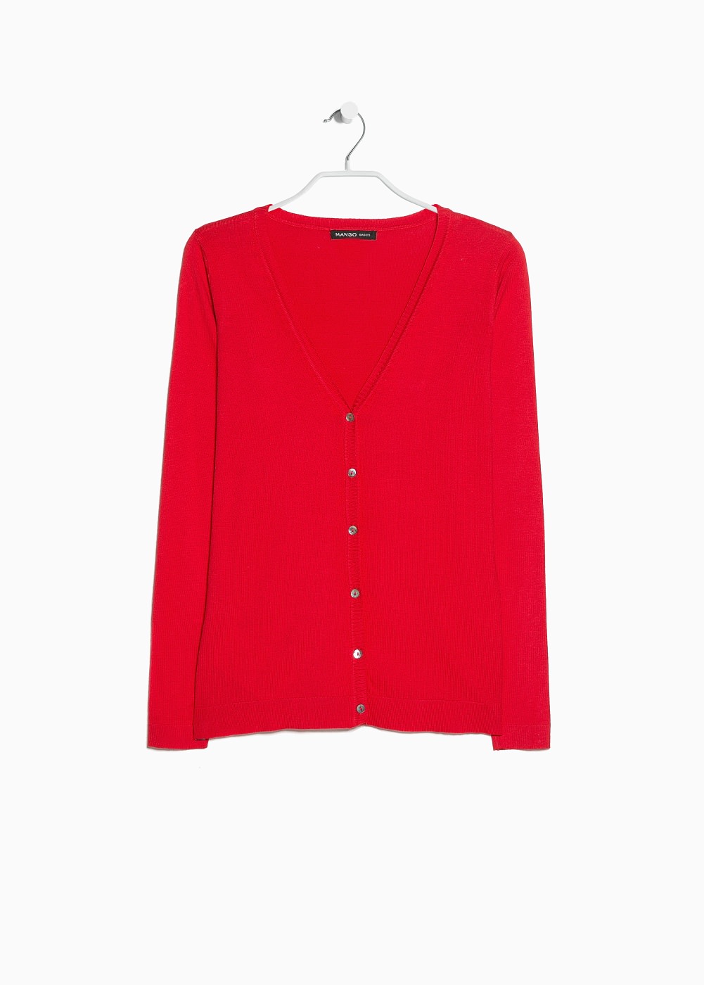 Cárdigan rojo cuello V de MANGO: ¿Qué color más navideño que el rojo para darle un toque de alegría a cualquier ocasión? He elegido este básico en un tono divertido para estas fiestas.