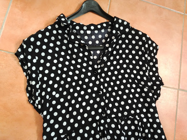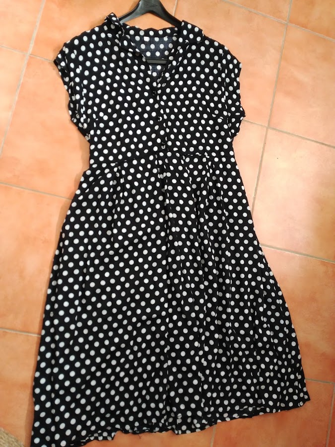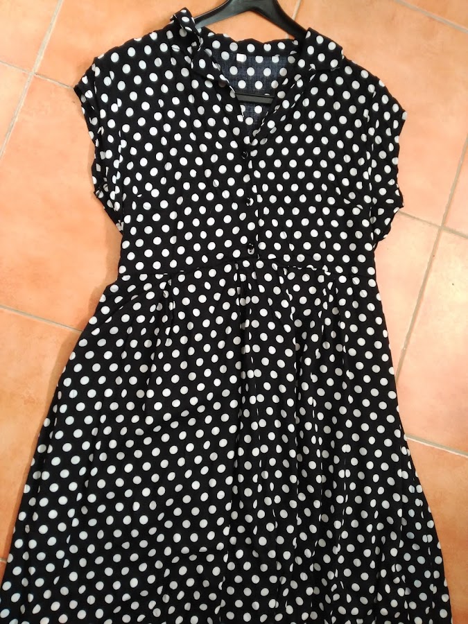 El vestido es preciosisimo. como veis es de lunares, abotonado en la parte de arriba y luego suelto en la parte baja, es de un estilo muy años 50, pero favorece muchísimo a la silueta.