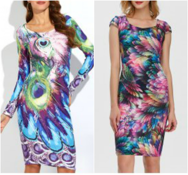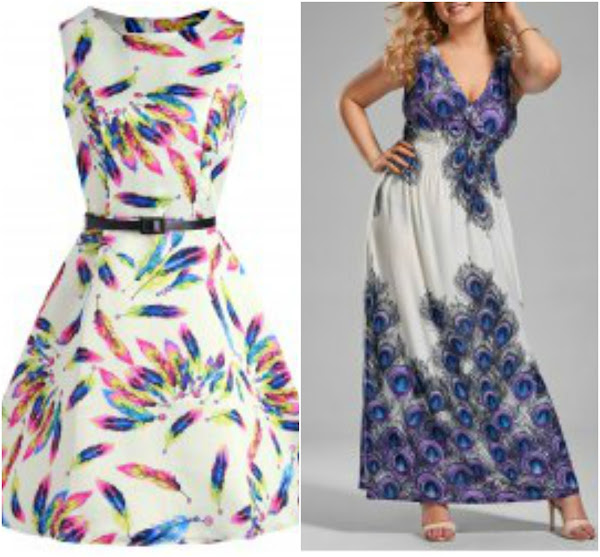Las dos cosas que compré me han gustado mucho y espero seguir comprando más, en esta tienda hay de todo y los precios están muy bien. Ahora está todo rebajado y he visto unos vestidos que me están gustando mucho que llevan plumas estampadas, como las del pavo de mi foto del domingo y no descarto comprar alguno de ellos. Estos son unos ejemplos: