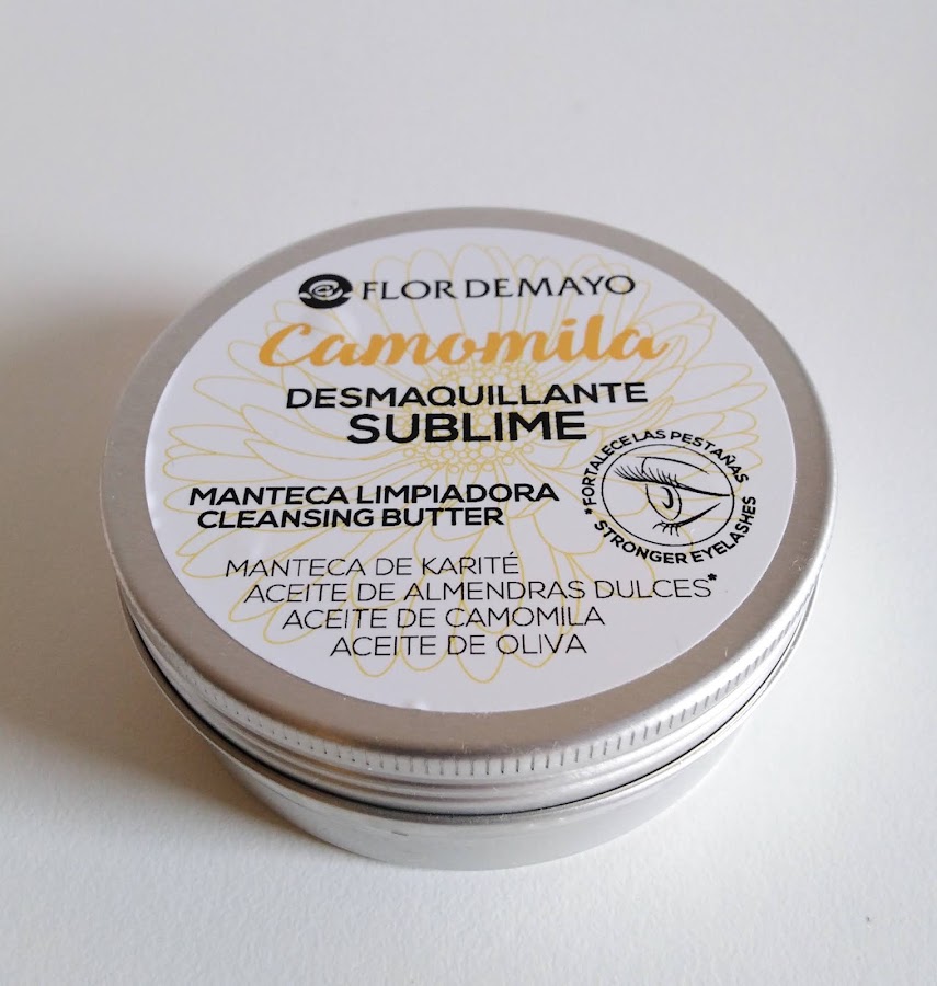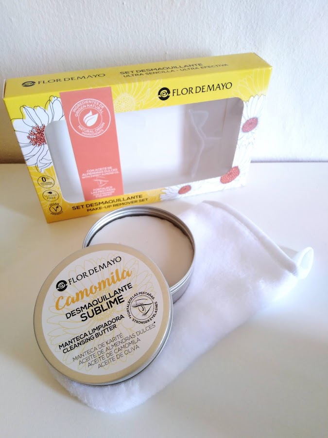 Esta ha sido mi última adquisición, el llamado "Desmaquillante sublime" de Flor de Mayo, una manteca limpiadora con mateca de karité y aceites varios (camomila, almendras dulces y oliva). El pack venía con una manopla de microfibra (que de momento he reservado).