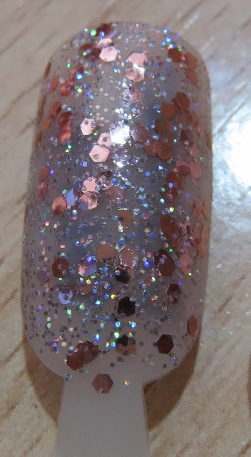 El siguiente es un esmalte de la gama Glitter de Flormar, más concretamente el GL02. Este me encanta. Tiene purpurina chiquitita y trozos más grandes y queda de color dorado/rosado. Es precioso. Recurro a el muy a menudo y me encanta. Yo me lo pongo en dos dedos y lo combino con el esmalte que lleve en ese momento. Lo compré en flormar y, si mal no recuerdo, rondaba los 4?.