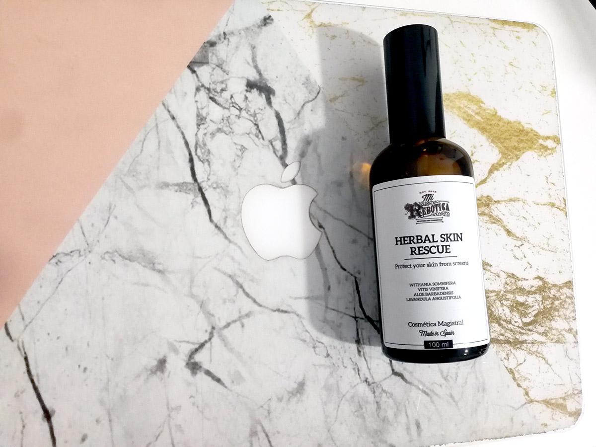 Otro producto que me ha impactado es Herbal Skin Rescue de Mi Rebotica. Es un un tónico en spray que ayuda a proteger la piel del efecto de las pantallas. Si ya no teníamos suficiente con los agentes externos que atacan a nuestra piel (el sol, la contaminación, etc.), ahora la tenemos que proteger también de la luz de las pantallas, ya que estamos demasiado sobreexpuestos a ellas a través del móvil, el ordenador, la TV, etc. Desde Mi Rebotica han estudiado este hecho y por eso han lanzado este producto. Es un tónico en spray para tener junto al ordenador y aplicarnos un poquito cuando empezamos a trabajar. Además, en verano se puede utilizar para refrescar la piel incluso encima del maquillaje. Un producto original que me ha gustado mucho.