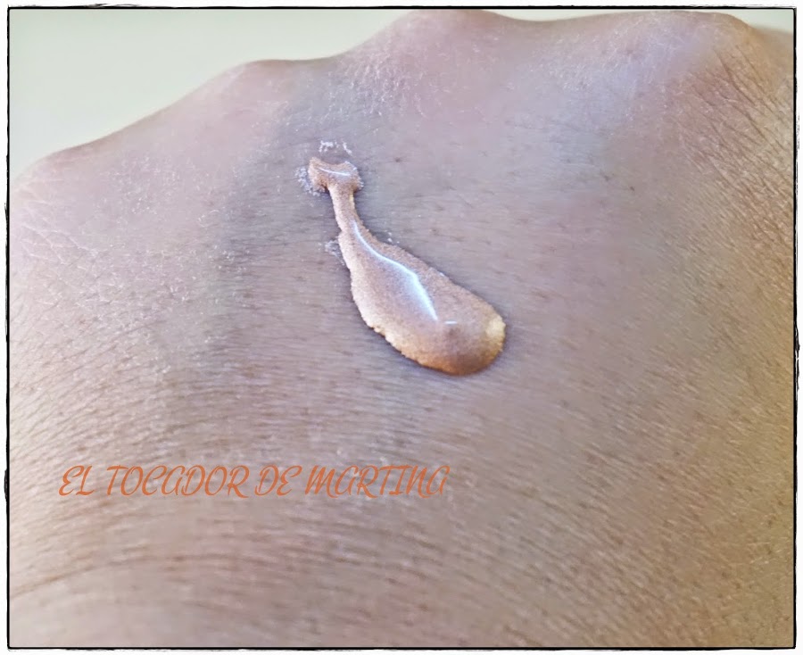 Es muy versátil, ya que por su tono lo podemos usar en cualquier época del año, no sólo cuando estamos bronceadas, su acabado es como de efecto mojado y nacarado, muy especial, y además es muy modulable, podemos empezar aplicando una gotita pequeña, si queremos un efecto sutil, e ir incrementando la cantidad para acabados más evidentes, para looks de noche, por ejemplo. Su acabado es nacarado pero no tiene destellos, y eso es algo que yo personalmente prefiero en un iluminador.