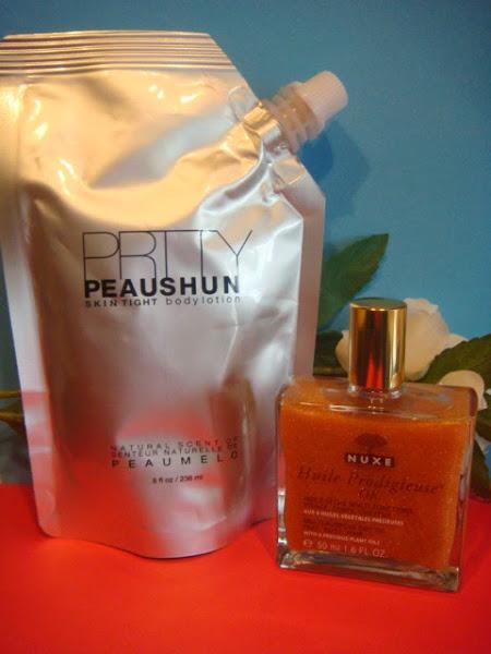 Mis favoritos son Prtty Peaushun, del que os hablé en esta entrada y Huile Prodigieuse OR de Nuxe. Ambos son estupendas opciones aunque son productos totalmente diferentes; mientras que Prtty Peaushun es mucho más versátil, más natural y con olor cítrico, OR tiene un aroma mucho más sensual, su textura es en aceite seco y es más purpurinoso.